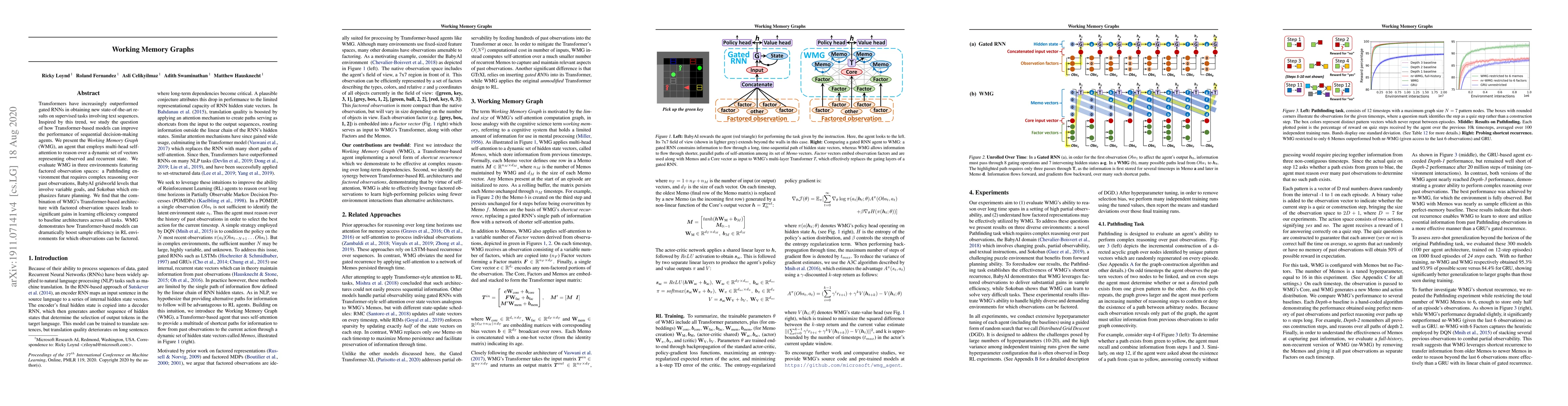 Transformers have increasingly outperformed gated RNNs in obtaining new state-of-the-art results on supervised tasks involving text sequences. Inspired by this trend, we study the question of how Transformer-based models can improve the performance of sequential decision-making agents. We present the Working Memory Graph (WMG), an agent that employs multi-head self-attention to reason over a dynamic set of vectors representing observed and recurrent state. We evaluate WMG in three environments featuring factored observation spaces: a Pathfinding environment that requires complex reasoning over past observations, BabyAI gridworld levels that involve variable goals, and Sokoban which emphasizes future planning. We find that the combination of WMG's Transformer-based architecture with factored observation spaces leads to significant gains in learning efficiency compared to baseline architectures across all tasks. WMG demonstrates how Transformer-based models can dramatically boost sample efficiency in RL environments for which observations can be factored.