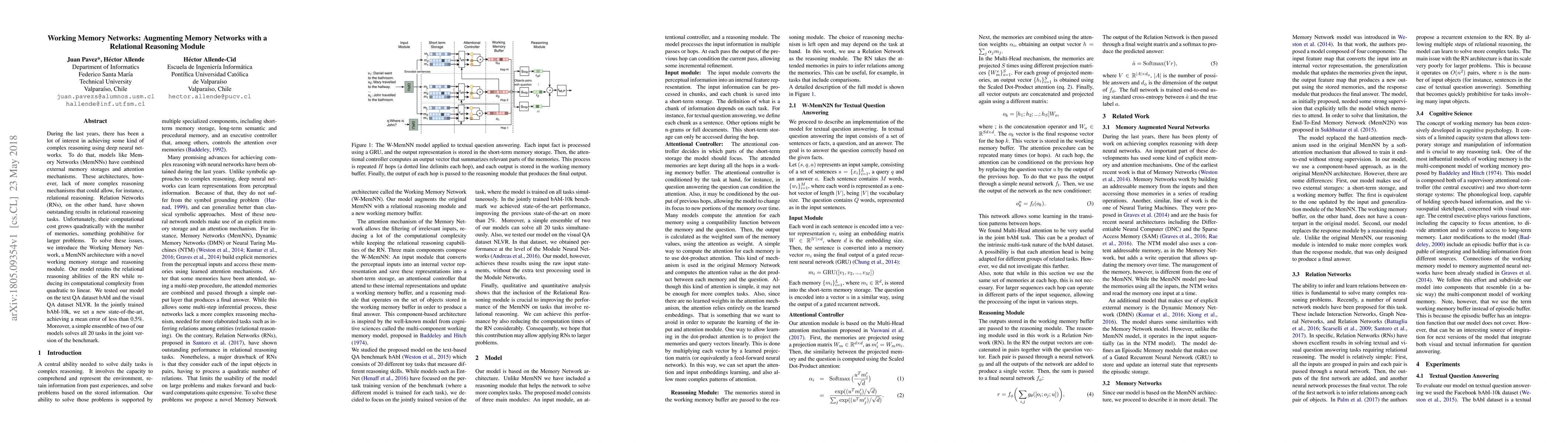 The paper proposes the Working Memory Network, a hybrid architecture combining Memory Networks with a relational reasoning module to enhance complex reasoning capabilities while reducing computational costs. The model achieves state-of-the-art results on bAbI and NLVR datasets, demonstrating effective relational reasoning with linear complexity.