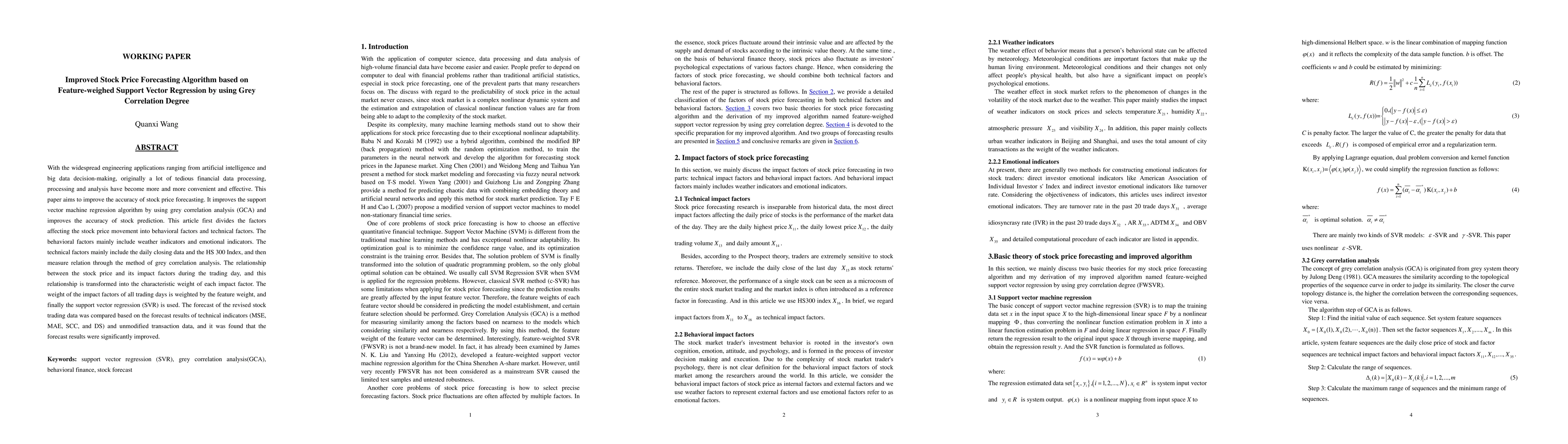 This paper proposes an improved stock price forecasting algorithm using feature-weighted support vector regression enhanced by grey correlation analysis. The method effectively integrates behavioral and technical factors, significantly improving the accuracy of stock predictions compared to traditional methods.