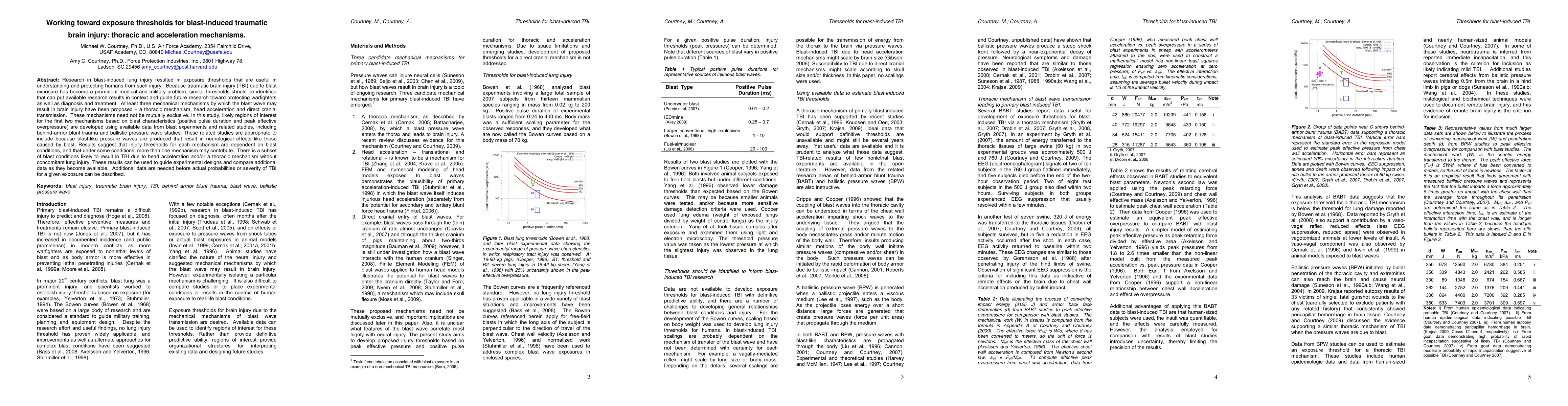 Research in blast-induced lung injury resulted in exposure thresholds that are useful in understanding and protecting humans from such injury. Because traumatic brain injury (TBI) due to blast exposure has become a prominent medical and military problem, similar thresholds should be identified that can put available research results in context and guide future research toward protecting warfighters as well as diagnosis and treatment. At least three mechanical mechanisms by which the blast wave may result in brain injury have been proposed - a thoracic mechanism, head acceleration and direct cranial transmission. These mechanisms need not be mutually exclusive. In this study, likely regions of interest for the first two mechanisms based on blast characteristics (positive pulse duration and peak effective overpressure) are developed using available data from blast experiments and related studies, including behind-armor blunt trauma and ballistic pressure wave studies. These related studies are appropriate to include because blast-like pressure waves are produced that result in neurological effects like those caused by blast. Results suggest that injury thresholds for each mechanism are dependent on blast conditions, and that under some conditions, more than one mechanism may contribute. There is a subset of blast conditions likely to result in TBI due to head acceleration and/or a thoracic mechanism without concomitant lung injury. These results can be used to guide experimental designs and compare additional data as they become available. Additional data are needed before actual probabilities or severity of TBI for a given exposure can be described.