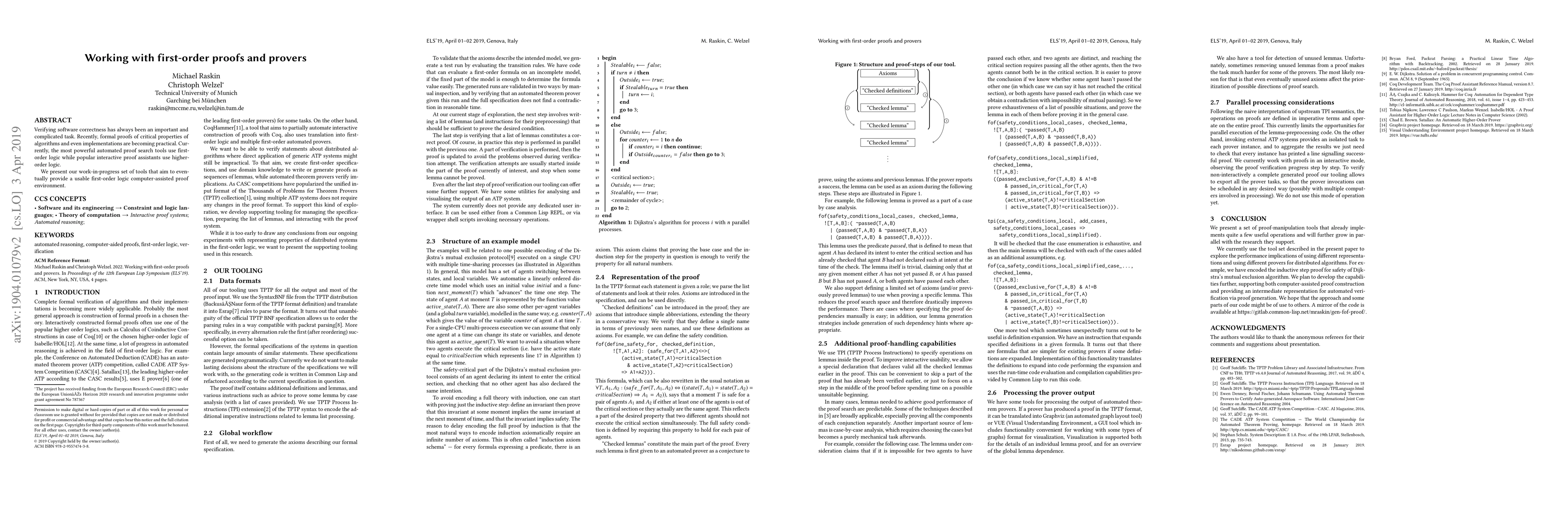 Verifying software correctness has always been an important and complicated task. Recently, formal proofs of critical properties of algorithms and even implementations are becoming practical. Currently, the most powerful automated proof search tools use first-order logic while popular interactive proof assistants use higher-order logic. We present our work-in-progress set of tools that aim to eventually provide a usable first-order logic computer-assisted proof environment.