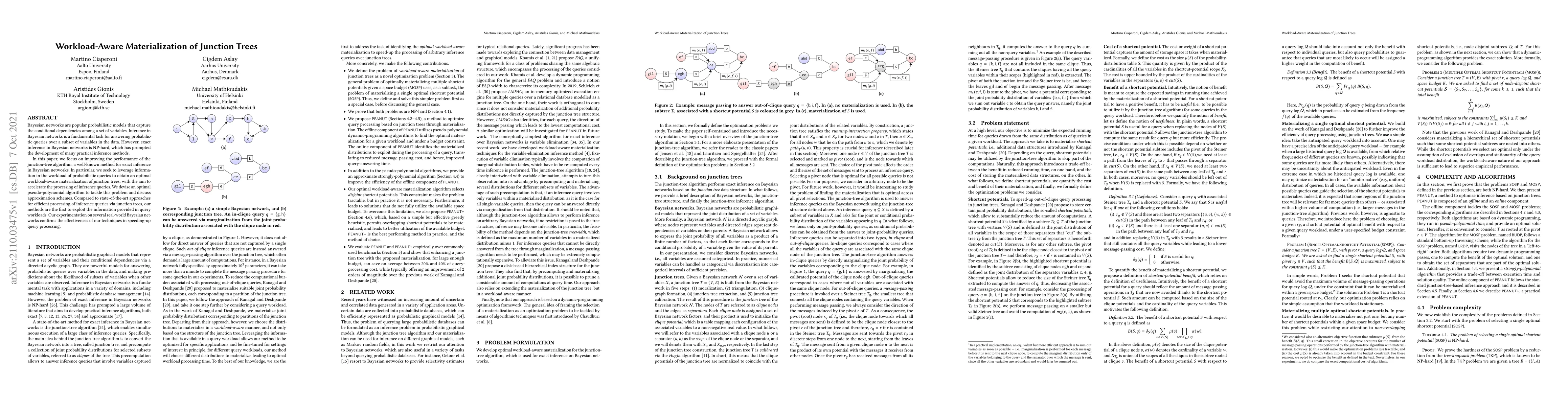 This paper proposes a workload-aware materialization of junction trees for efficient Bayesian network inference, leveraging query patterns to optimize performance. The authors introduce a pseudo-polynomial algorithm and approximation schemes, demonstrating significant speedups over existing methods through experiments on real-world datasets.