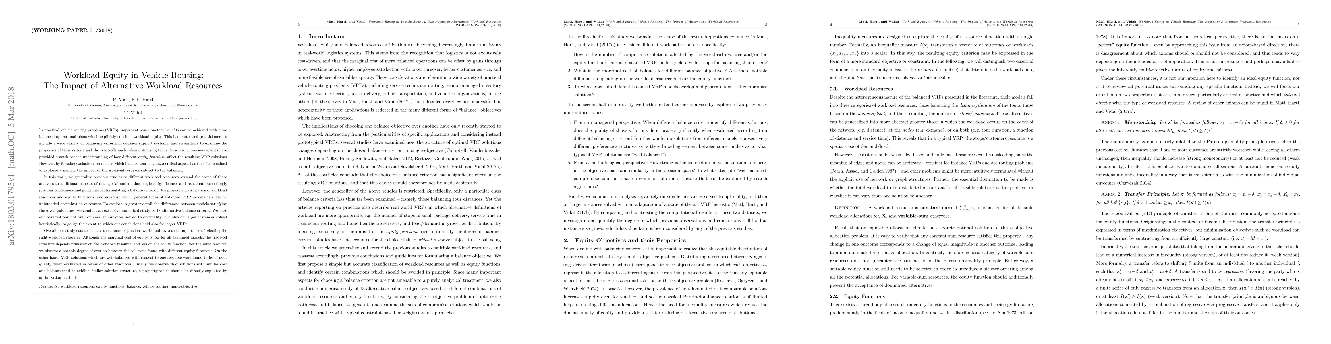 This paper investigates the impact of different workload resources on vehicle routing problem (VRP) solutions, proposing a classification of workload resources and equity functions. It conducts an extensive numerical study to reveal how various balance criteria affect optimization outcomes, emphasizing the importance of selecting the appropriate workload resource for achieving equitable operational plans.
