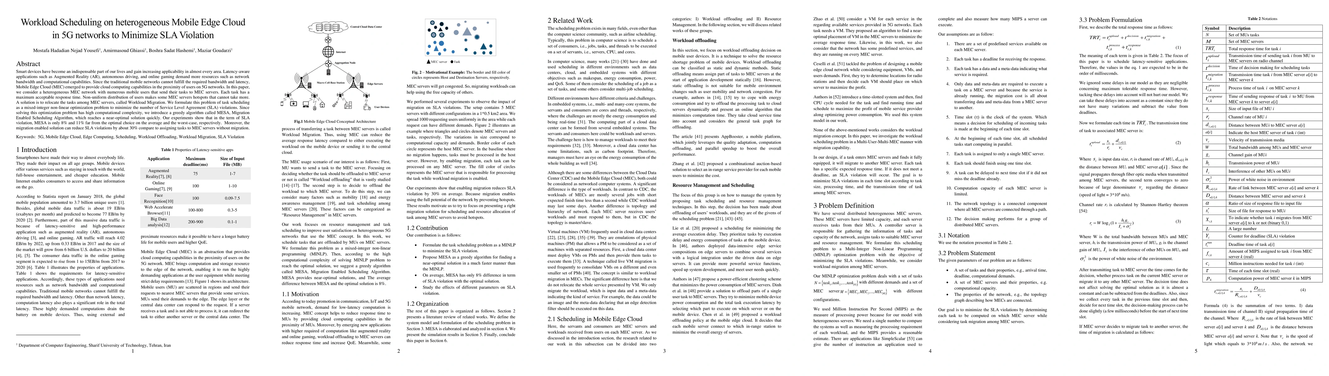 This paper proposes a mixed-integer non-linear optimization problem to minimize Service Level Agreement (SLA) violations in heterogeneous Mobile Edge Cloud (MEC) networks. It introduces a greedy algorithm, MESA, which achieves near-optimal task scheduling and workload migration to reduce SLA violations by approximately 30% compared to non-migratory approaches.