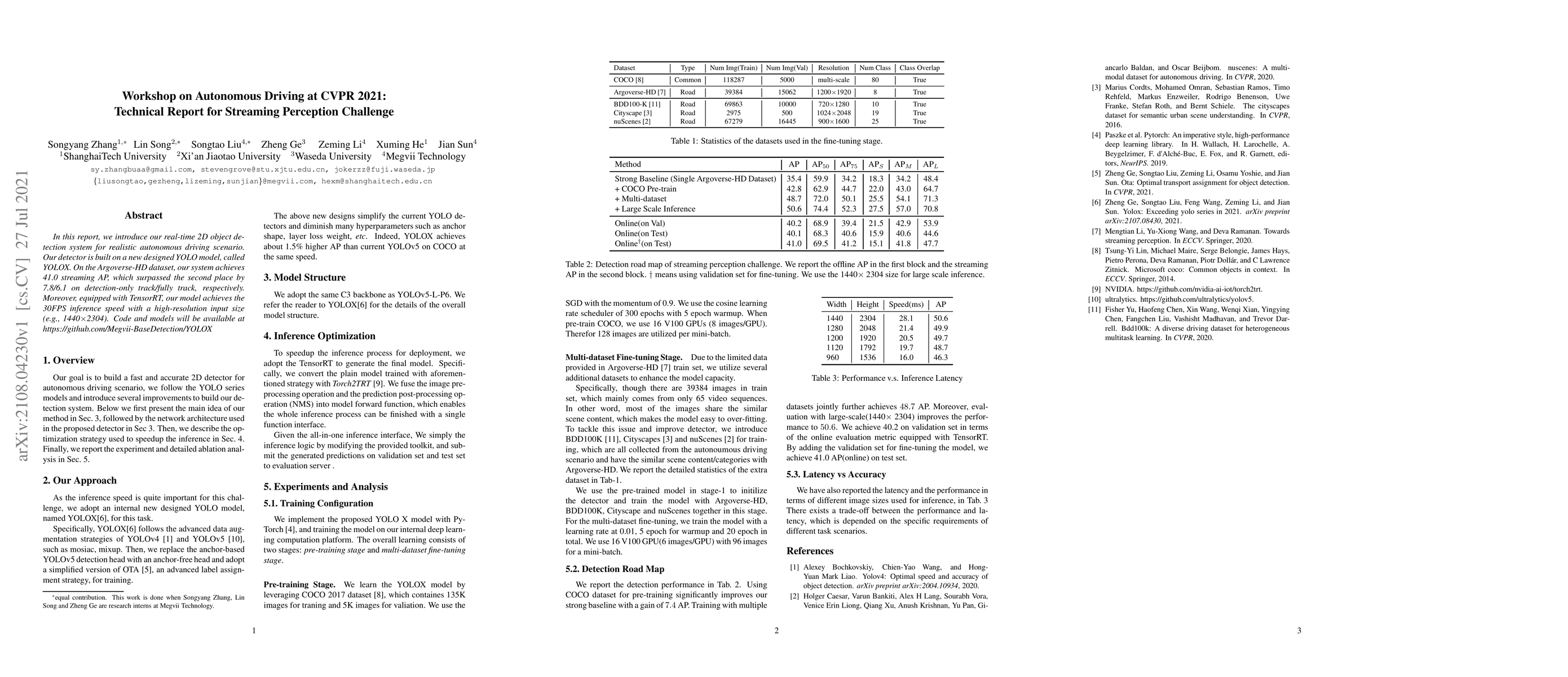 In this report, we introduce our real-time 2D object detection system for the realistic autonomous driving scenario. Our detector is built on a newly designed YOLO model, called YOLOX. On the Argoverse-HD dataset, our system achieves 41.0 streaming AP, which surpassed second place by 7.8/6.1 on detection-only track/fully track, respectively. Moreover, equipped with TensorRT, our model achieves the 30FPS inference speed with a high-resolution input size (e.g., 1440-2304). Code and models will be available at https://github.com/Megvii-BaseDetection/YOLOX