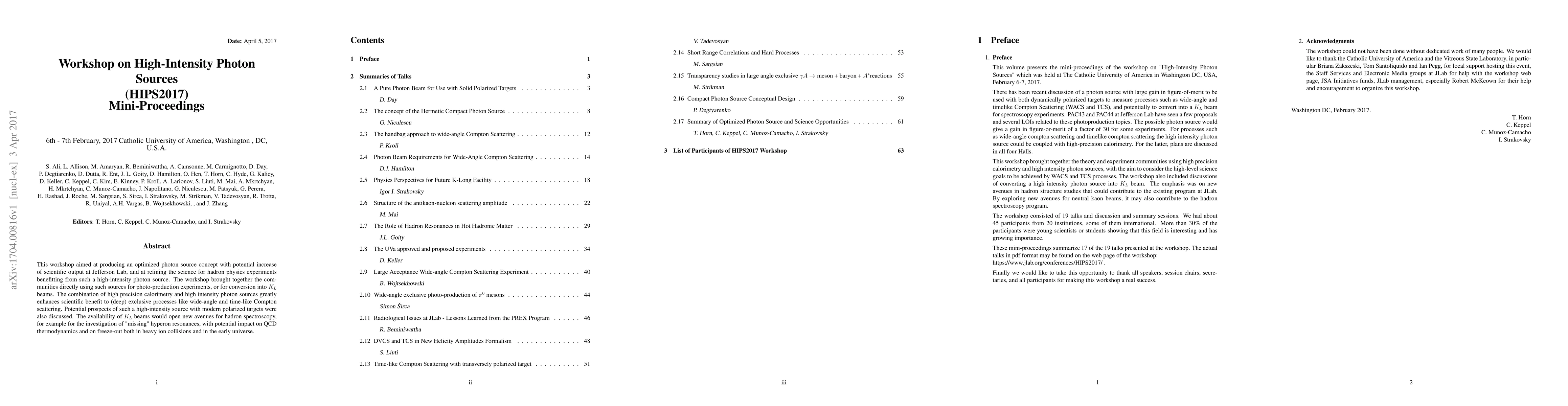 The HIPS2017 workshop focused on optimizing a high-intensity photon source to boost scientific output at Jefferson Lab, particularly for hadron physics experiments. Discussions included the potential benefits of combining high-intensity photon sources with high-precision calorimetry for deep exclusive processes and the prospects of using $K_L$ beams for hadron spectroscopy.