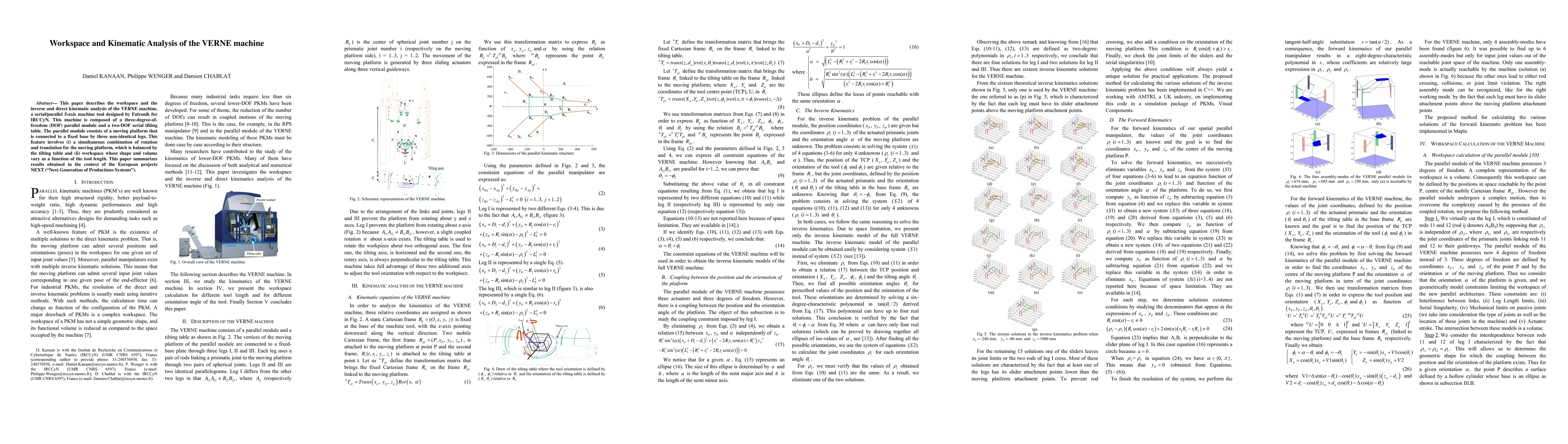 This paper analyzes the workspace and kinematics of the VERNE machine, a 5-axis machine tool that combines rotation and translation, with varying workspace shape and volume based on tool length.