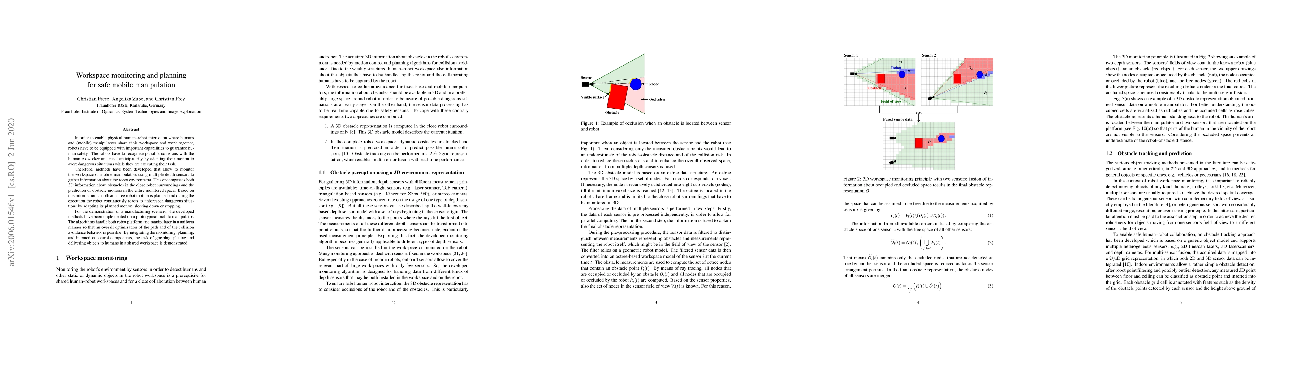 This paper presents methods for safe mobile manipulation in shared human-robot workspaces, utilizing depth sensors for real-time monitoring and collision prediction. The approach enables adaptive collision-free motion planning and execution, demonstrated through a prototype mobile manipulator in a manufacturing scenario.