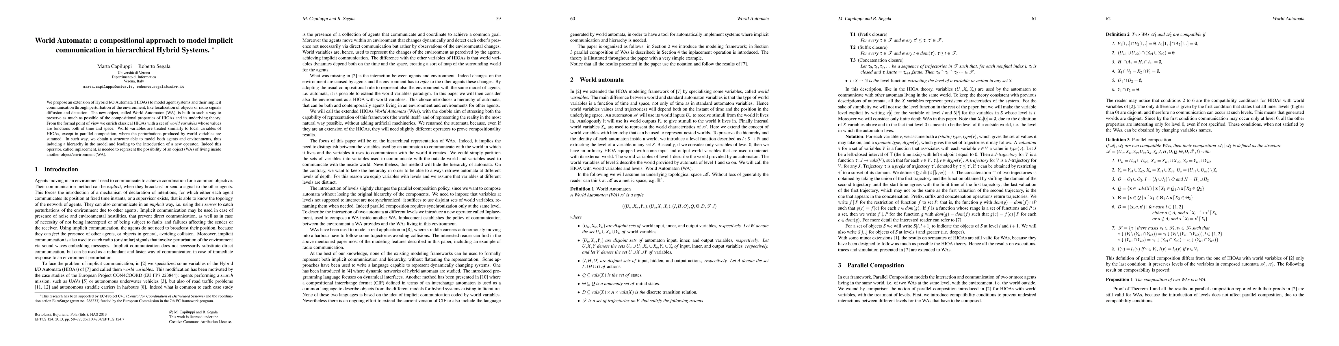 We propose an extension of Hybrid I/O Automata (HIOAs) to model agent systems and their implicit communication through perturbation of the environment, like localization of objects or radio signals diffusion and detection. The new object, called World Automaton (WA), is built in such a way to preserve as much as possible of the compositional properties of HIOAs and its underlying theory. From the formal point of view we enrich classical HIOAs with a set of world variables whose values are functions both of time and space. World variables are treated similarly to local variables of HIOAs, except in parallel composition, where the perturbations produced by world variables are summed. In such way, we obtain a structure able to model both agents and environments, thus inducing a hierarchy in the model and leading to the introduction of a new operator. Indeed this operator, called inplacement, is needed to represent the possibility of an object (WA) of living inside another object/environment (WA).