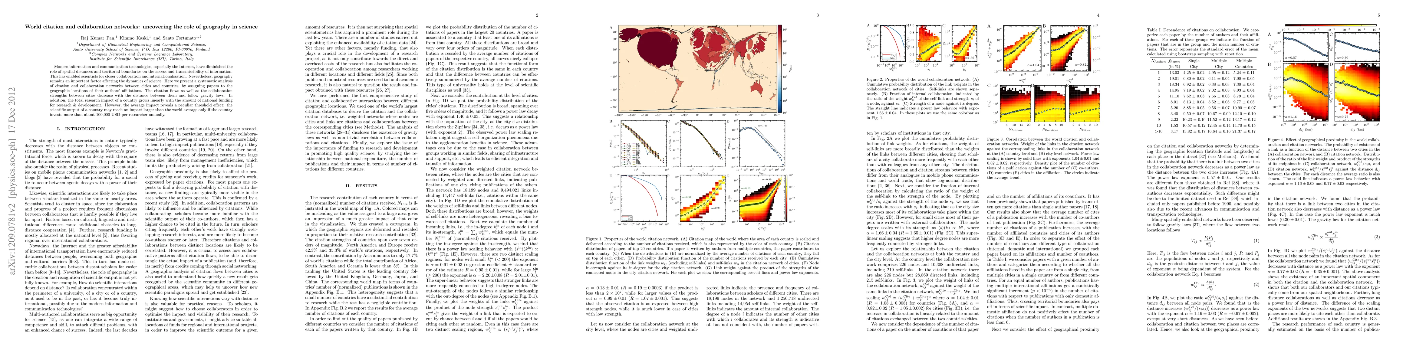This paper analyzes the impact of geography on scientific collaboration and citation networks, finding that both decrease with distance and follow gravity laws. It also reveals that national funding significantly boosts a country's research impact, with a notable threshold effect above $100,000 per researcher annually for surpassing global average impact.