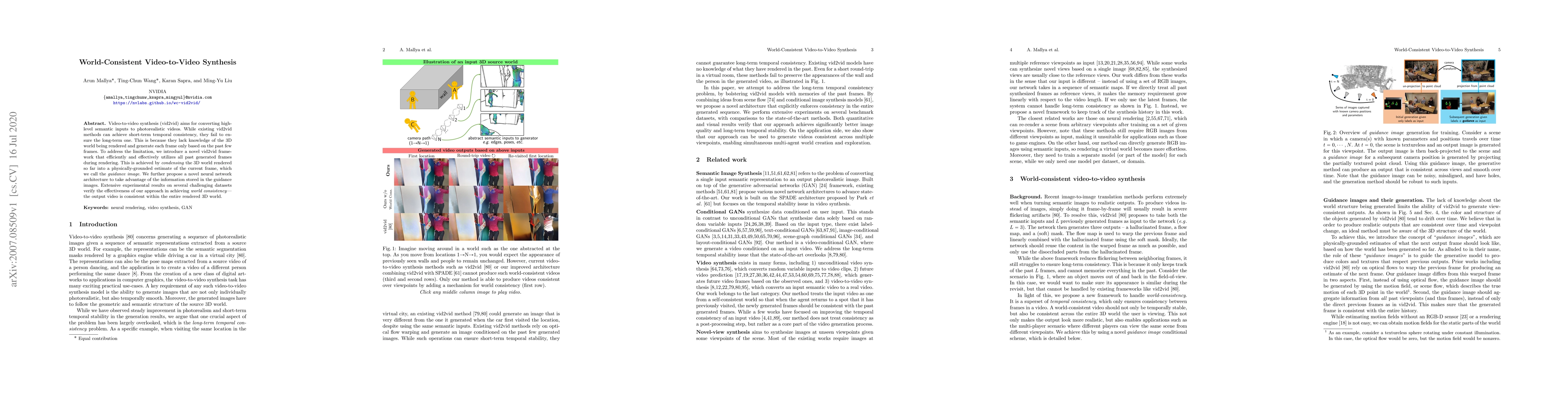 This paper introduces a novel video-to-video synthesis framework that enhances long-term temporal consistency by incorporating a guidance image, which condenses past frames into a 3D world estimate, and employs a specialized neural network to leverage this information. Experimental results demonstrate improved world consistency across various datasets.