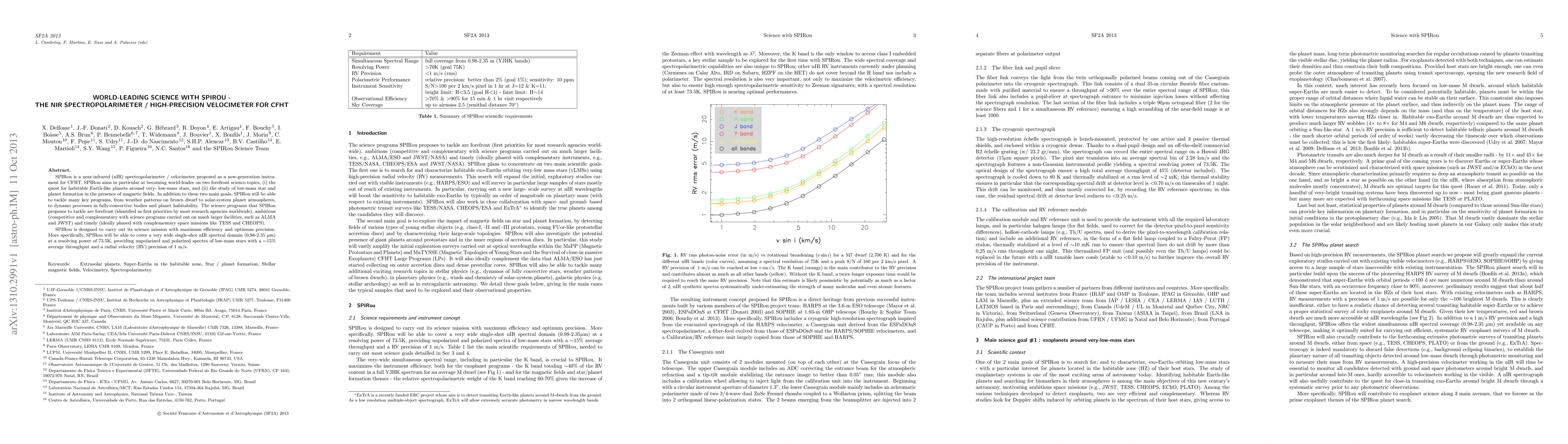 SPIRou is a near-infrared (nIR) spectropolarimeter / velocimeter proposed as a new-generation instrument for CFHT. SPIRou aims in particular at becoming world-leader on two forefront science topics, (i) the quest for habitable Earth-like planets around very- low-mass stars, and (ii) the study of low-mass star and planet formation in the presence of magnetic fields. In addition to these two main goals, SPIRou will be able to tackle many key programs, from weather patterns on brown dwarf to solar-system planet atmospheres, to dynamo processes in fully-convective bodies and planet habitability. The science programs that SPIRou proposes to tackle are forefront (identified as first priorities by most research agencies worldwide), ambitious (competitive and complementary with science programs carried out on much larger facilities, such as ALMA and JWST) and timely (ideally phased with complementary space missions like TESS and CHEOPS). SPIRou is designed to carry out its science mission with maximum efficiency and optimum precision. More specifically, SPIRou will be able to cover a very wide single-shot nIR spectral domain (0.98-2.35 \mu m) at a resolving power of 73.5K, providing unpolarized and polarized spectra of low-mass stars with a ~15% average throughput and a radial velocity (RV) precision of 1 m/s.