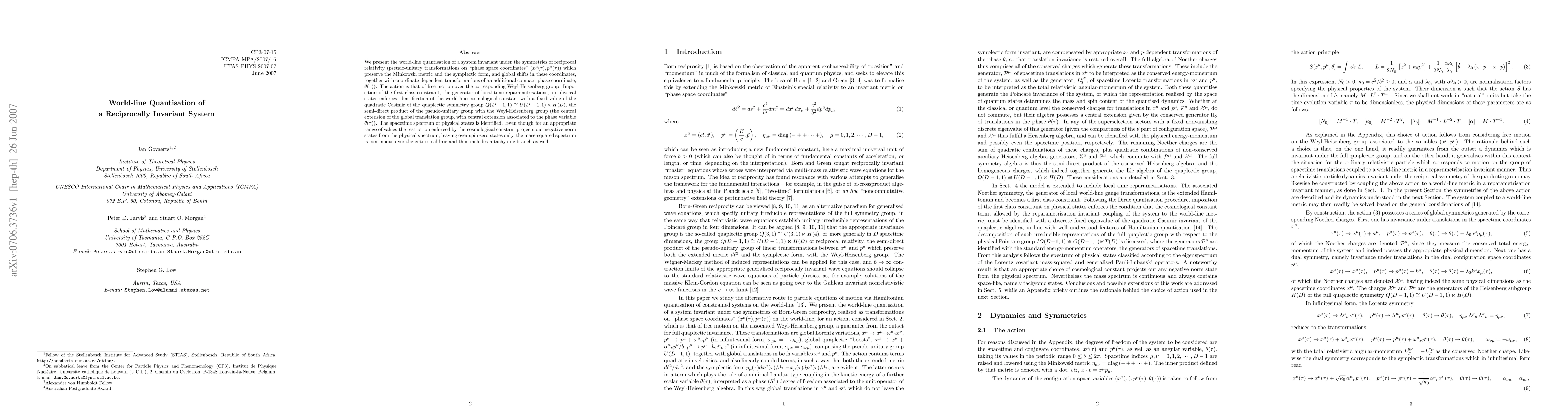 We present the world-line quantisation of a system invariant under the symmetries of reciprocal relativity (pseudo-unitary transformations on ``phase space coordinates" $(x^\mu(\tau),p^\mu(\tau))$ which preserve the Minkowski metric and the symplectic form, and global shifts in these coordinates, together with coordinate dependent transformations of an additional compact phase coordinate, $\theta(\tau)$). The action is that of free motion over the corresponding Weyl-Heisenberg group. Imposition of the first class constraint, the generator of local time reparametrisations, on physical states enforces identification of the world-line cosmological constant with a fixed value of the quadratic Casimir of the quaplectic symmetry group $Q(D-1,1)\cong U(D-1,1)\ltimes H(D)$, the semi-direct product of the pseudo-unitary group with the Weyl-Heisenberg group (the central extension of the global translation group, with central extension associated to the phase variable $\theta(\tau)$). The spacetime spectrum of physical states is identified. Even though for an appropriate range of values the restriction enforced by the cosmological constant projects out negative norm states from the physical spectrum, leaving over spin zero states only, the mass-squared spectrum is continuous over the entire real line and thus includes a tachyonic branch as well.