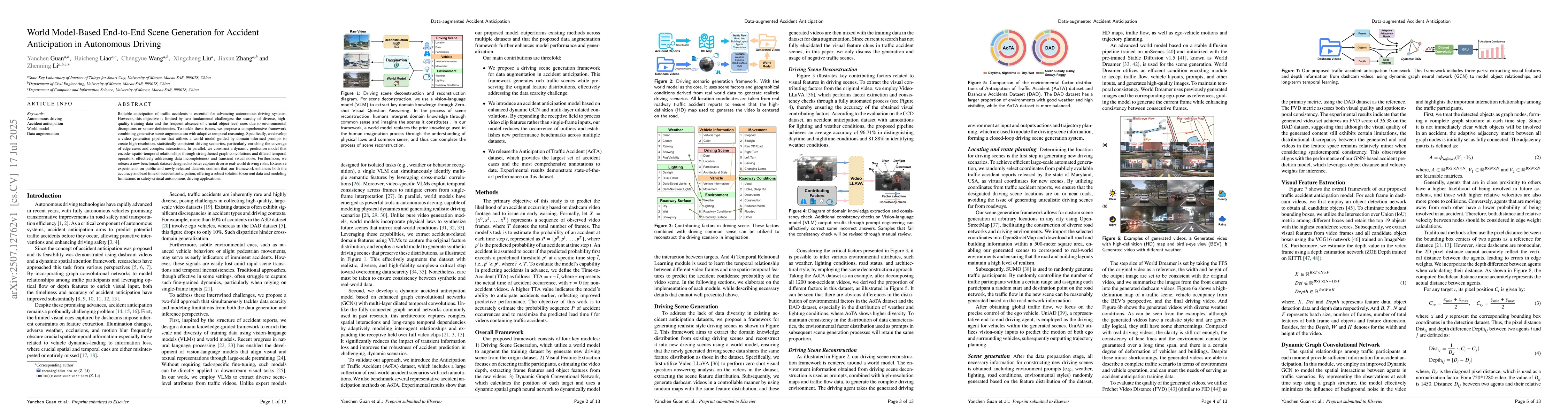 Reliable anticipation of traffic accidents is essential for advancing autonomous driving systems. However, this objective is limited by two fundamental challenges: the scarcity of diverse, high-quality training data and the frequent absence of crucial object-level cues due to environmental disruptions or sensor deficiencies. To tackle these issues, we propose a comprehensive framework combining generative scene augmentation with adaptive temporal reasoning. Specifically, we develop a video generation pipeline that utilizes a world model guided by domain-informed prompts to create high-resolution, statistically consistent driving scenarios, particularly enriching the coverage of edge cases and complex interactions. In parallel, we construct a dynamic prediction model that encodes spatio-temporal relationships through strengthened graph convolutions and dilated temporal operators, effectively addressing data incompleteness and transient visual noise. Furthermore, we release a new benchmark dataset designed to better capture diverse real-world driving risks. Extensive experiments on public and newly released datasets confirm that our framework enhances both the accuracy and lead time of accident anticipation, offering a robust solution to current data and modeling limitations in safety-critical autonomous driving applications.