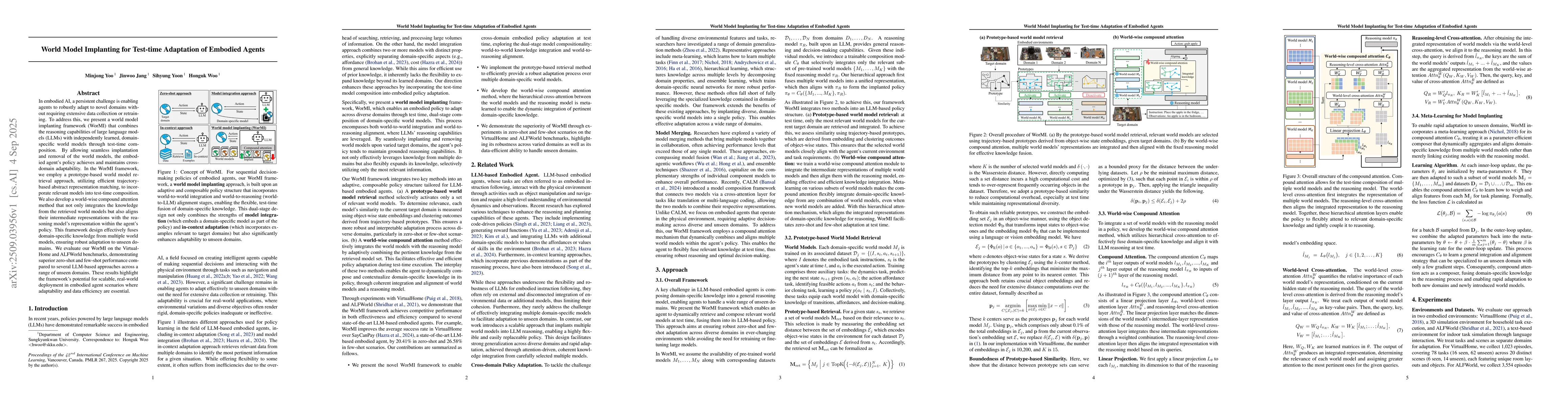 In embodied AI, a persistent challenge is enabling agents to robustly adapt to novel domains without requiring extensive data collection or retraining. To address this, we present a world model implanting framework (WorMI) that combines the reasoning capabilities of large language models (LLMs) with independently learned, domain-specific world models through test-time composition. By allowing seamless implantation and removal of the world models, the embodied agent's policy achieves and maintains cross-domain adaptability. In the WorMI framework, we employ a prototype-based world model retrieval approach, utilizing efficient trajectory-based abstract representation matching, to incorporate relevant models into test-time composition. We also develop a world-wise compound attention method that not only integrates the knowledge from the retrieved world models but also aligns their intermediate representations with the reasoning model's representation within the agent's policy. This framework design effectively fuses domain-specific knowledge from multiple world models, ensuring robust adaptation to unseen domains. We evaluate our WorMI on the VirtualHome and ALFWorld benchmarks, demonstrating superior zero-shot and few-shot performance compared to several LLM-based approaches across a range of unseen domains. These results highlight the frameworks potential for scalable, real-world deployment in embodied agent scenarios where adaptability and data efficiency are essential.