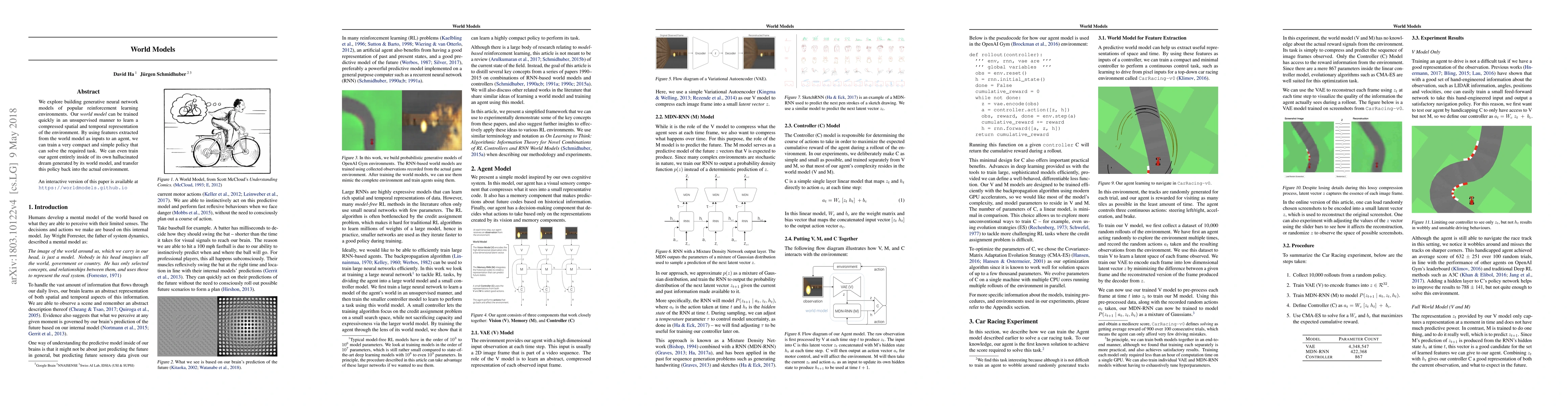 We explore building generative neural network models of popular reinforcement learning environments. Our world model can be trained quickly in an unsupervised manner to learn a compressed spatial and temporal representation of the environment. By using features extracted from the world model as inputs to an agent, we can train a very compact and simple policy that can solve the required task. We can even train our agent entirely inside of its own hallucinated dream generated by its world model, and transfer this policy back into the actual environment. An interactive version of this paper is available at https://worldmodels.github.io/