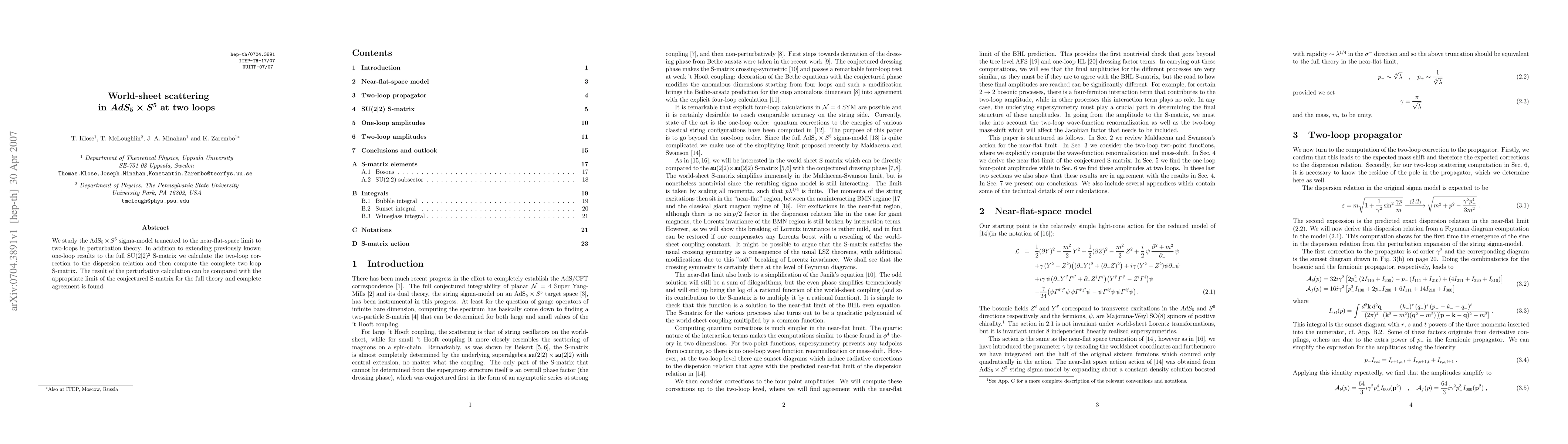 Researchers calculated the two-loop scattering matrix for AdS_5 x S^5 sigma-model, extending previously known one-loop results, and found agreement with a conjectured limit of the full theory's S-matrix.
