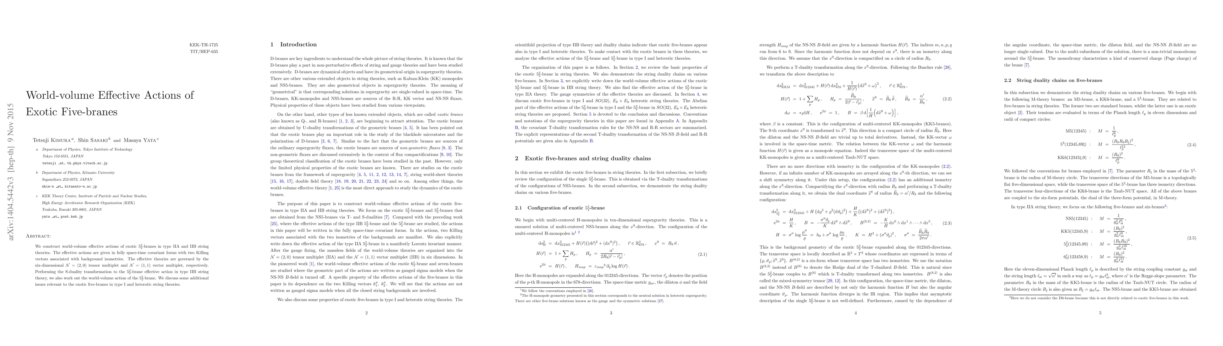 We construct world-volume effective actions of exotic $5^2_2$-branes in type IIA and IIB string theories. The effective actions are given in fully space-time covariant forms with two Killing vectors associated with background isometries. The effective theories are governed by the six-dimensional $\mathcal{N}=(2,0)$ tensor multiplet and $\mathcal{N}=(1,1)$ vector multiplet, respectively. Performing the S-duality transformation to the $5^2_2$-brane effective action in type IIB string theory, we also work out the world-volume action of the $5^2_3$-brane. We discuss some additional issues relevant to the exotic five-branes in type I and heterotic string theories.