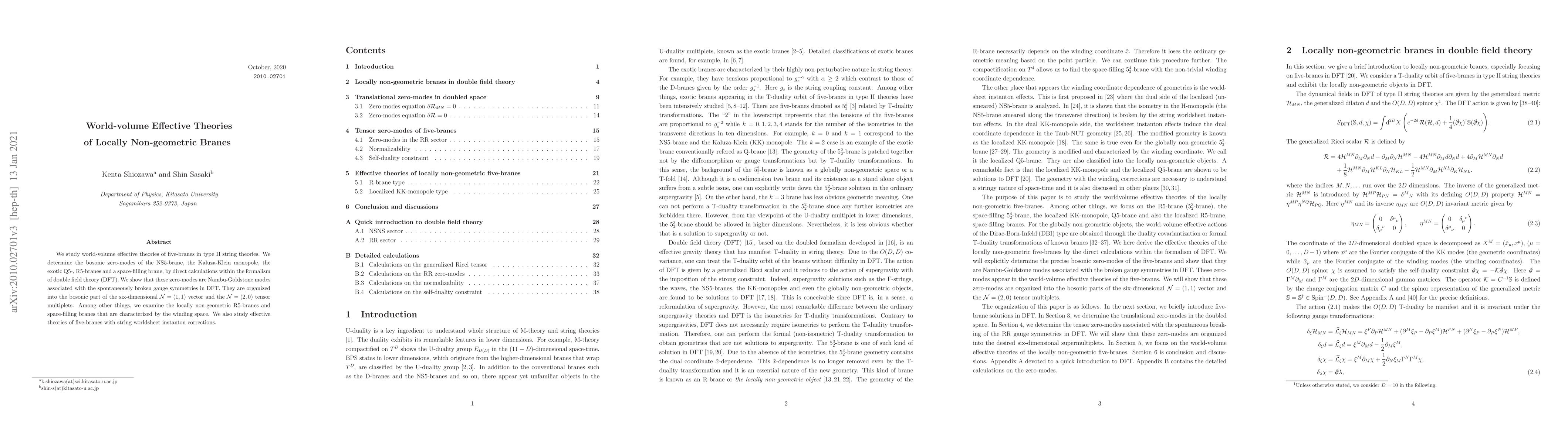 This paper investigates the world-volume effective theories of five-branes in type II string theories, identifying the bosonic zero-modes of various branes using double field theory. It reveals these zero-modes as Nambu-Goldstone modes linked to spontaneously broken gauge symmetries, organized into specific multiplets, and explores the locally non-geometric R5-branes and space-filling branes.