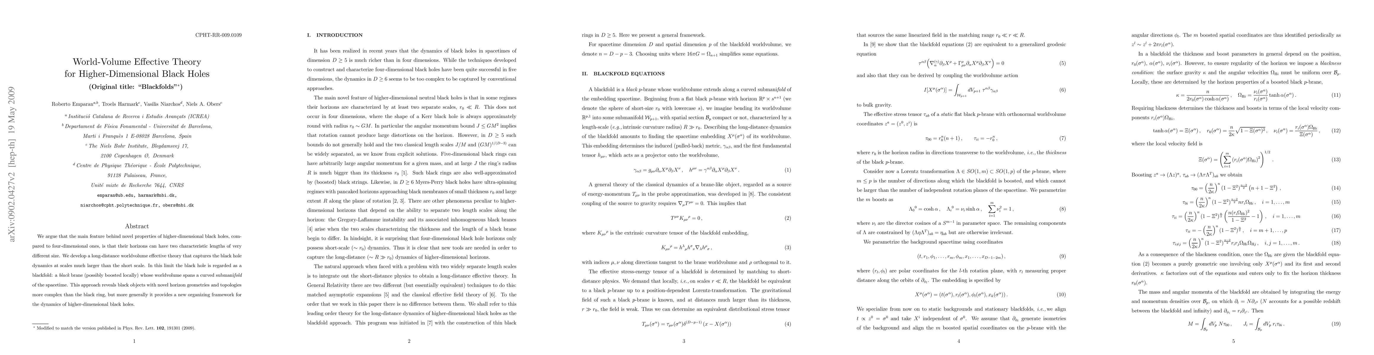 This paper develops a worldvolume effective theory for higher-dimensional black holes, highlighting their unique horizon geometries with two distinct length scales. It introduces the concept of a blackfold, a black brane whose dynamics are described by a curved submanifold, providing a new framework for understanding the complex dynamics of these higher-dimensional black objects.