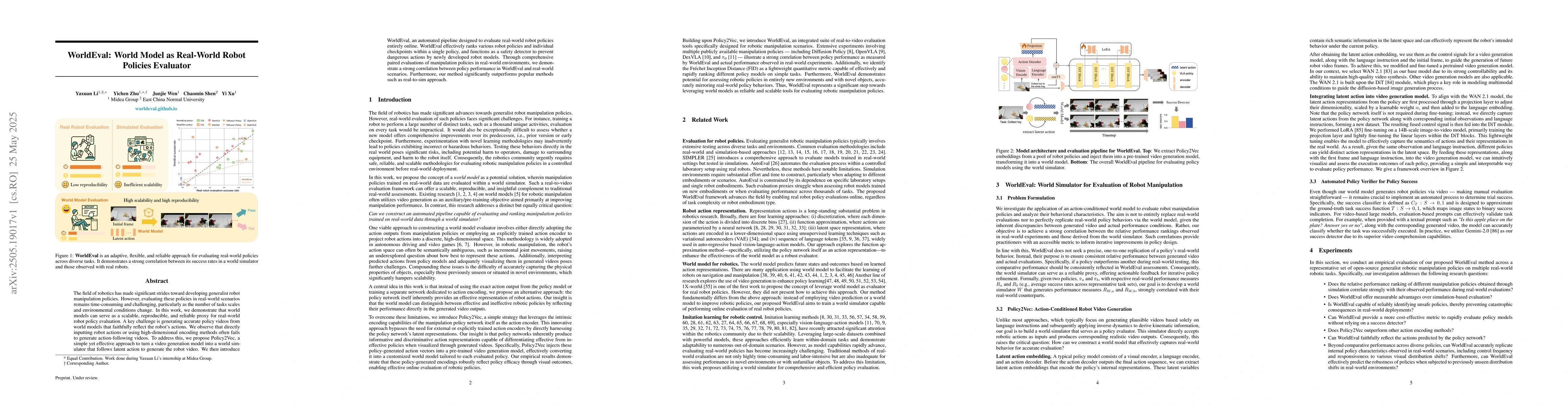 The research proposes using world models to evaluate real-world robot policies, addressing the challenge of scalable, reproducible, and reliable evaluation. It introduces Policy2Vec to convert a video generation model into a world simulator following latent actions, and WorldEval, an automated pipeline for online policy evaluation.