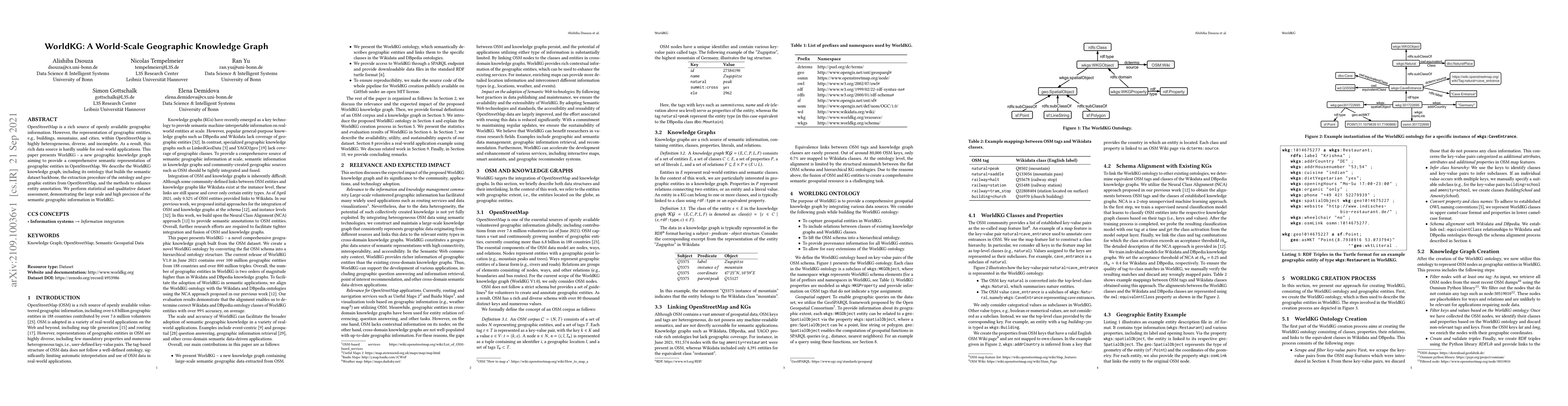 WorldKG is a new geographic knowledge graph derived from OpenStreetMap, aiming to provide a comprehensive and semantically rich representation of geographic entities. The paper details the ontology, extraction procedures, and methods for enhancing entity annotation, showcasing the large scale and high precision of the resulting dataset.