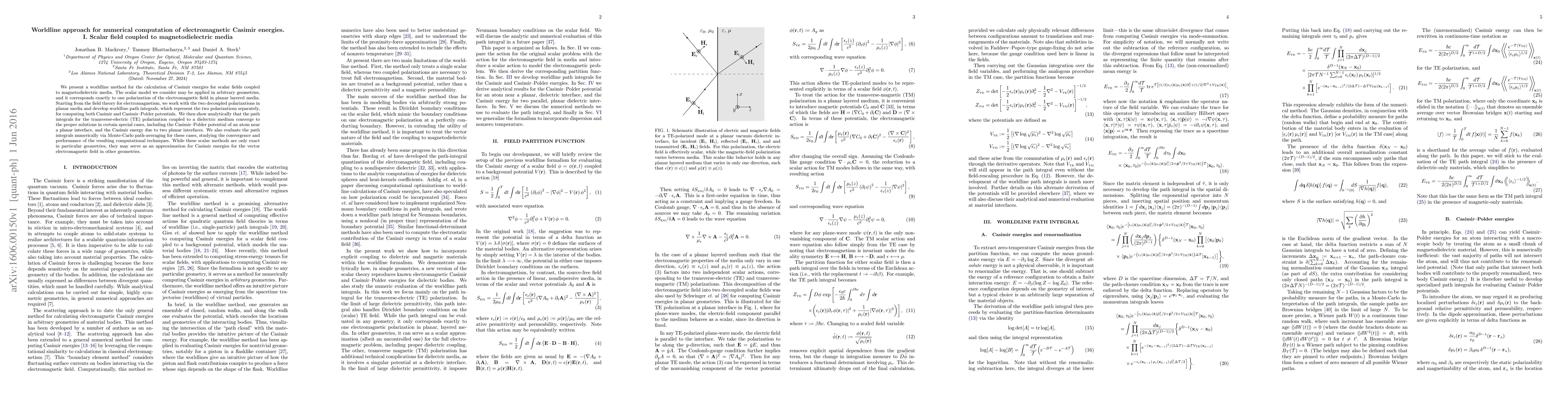 This paper introduces a worldline method for calculating Casimir energies in scalar fields coupled to magnetodielectric media, focusing on planar geometries. The method is numerically evaluated using Monte-Carlo techniques, demonstrating convergence and applicability to approximate electromagnetic field Casimir effects in various geometries.