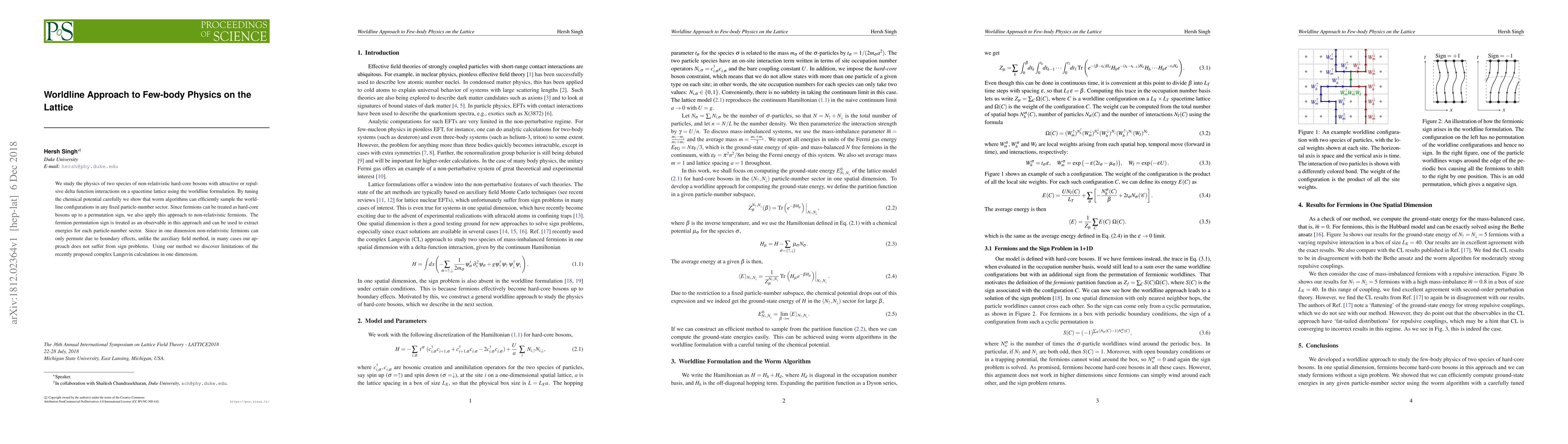 We study the physics of two species of non-relativistic hard-core bosons with attractive or repulsive delta function interactions on a spacetime lattice using the worldline formulation. By tuning the chemical potential carefully we show that worm algorithms can efficiently sample the worldline configurations in any fixed particle-number sector. Since fermions can be treated as hard-core bosons up to a permutation sign, we also apply this approach to non-relativistic fermions. The fermion permutation sign is treated as an observable in this approach and can be used to extract energies for each particle-number sector. Since in one dimension non-relativistic fermions can only permute due to boundary effects, unlike the auxiliary field method, in many cases our approach does not suffer from sign problems. Using our method we discover limitations of the recently proposed complex Langevin calculations in one dimension.