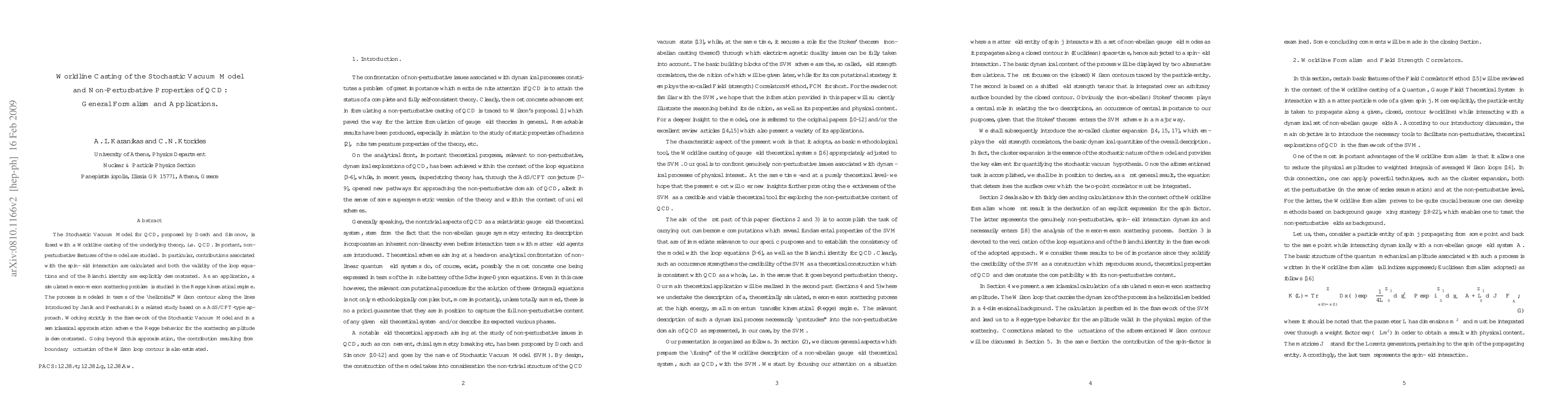 The Stochastic Vacuum Model for QCD, proposed by Dosch and Simonov, is fused with a Worldline casting of the underlying theory, i.e. QCD. Important, non-perturbative features of the model are studied. In particular, contributions associated with the spin-field interaction are calculated and both the validity of the loop equations and of the Bianchi identity are explicitly demonstrated. As an application, a simulated meson-meson scattering problem is studied in the Regge kinematical regime. The process is modeled in terms of the "helicoidal" Wilson contour along the lines introduced by Janik and Peschanski in a related study based on a AdS/CFT-type approach. Working strictly in the framework of the Stochastic Vacuum Model and in a semiclassical approximation scheme the Regge behavior for the Scattering amplitude is demonstrated. Going beyond this approximation, the contribution resulting from boundary fluctuation of the Wilson loop contour is also estimated.
