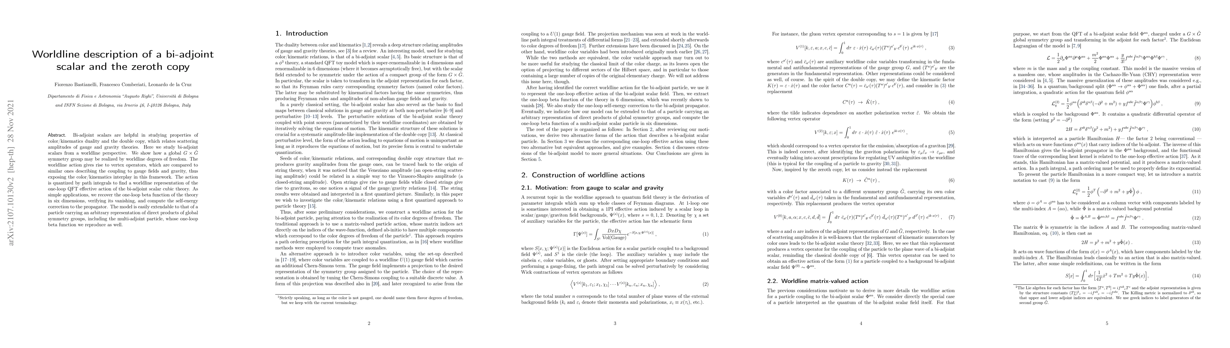This paper studies bi-adjoint scalars from a worldline perspective, revealing a global $G imes ilde G$ symmetry group and its connection to color/kinematics duality and the double copy in gauge and gravity theories.