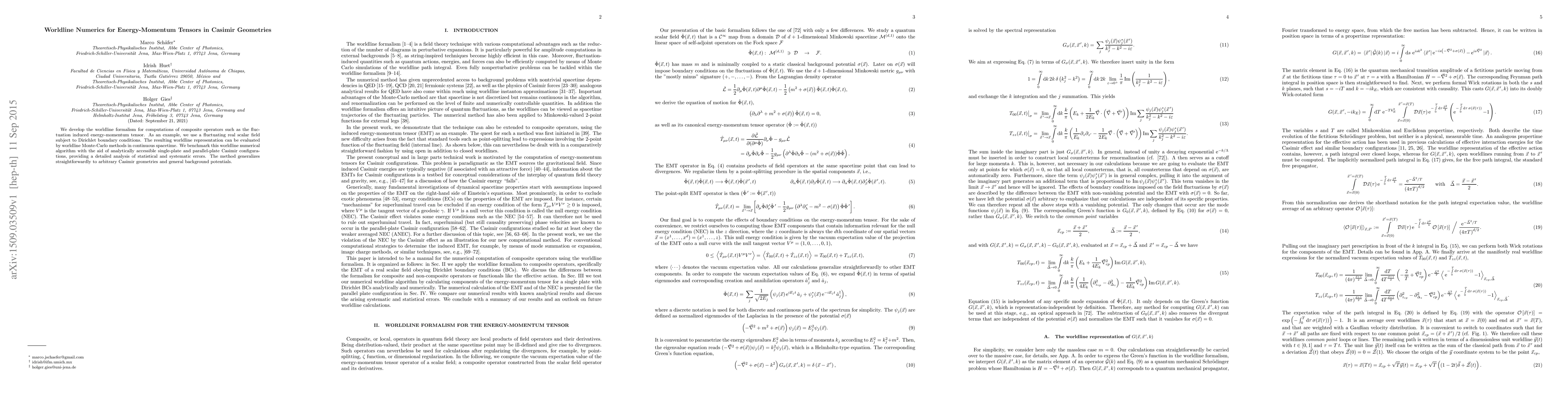 This paper develops a worldline formalism for calculating composite operators like the energy-momentum tensor in Casimir geometries, exemplified by a fluctuating scalar field. It evaluates the method using Monte-Carlo simulations and benchmarks it against analytically solvable cases, demonstrating its applicability to various geometries.