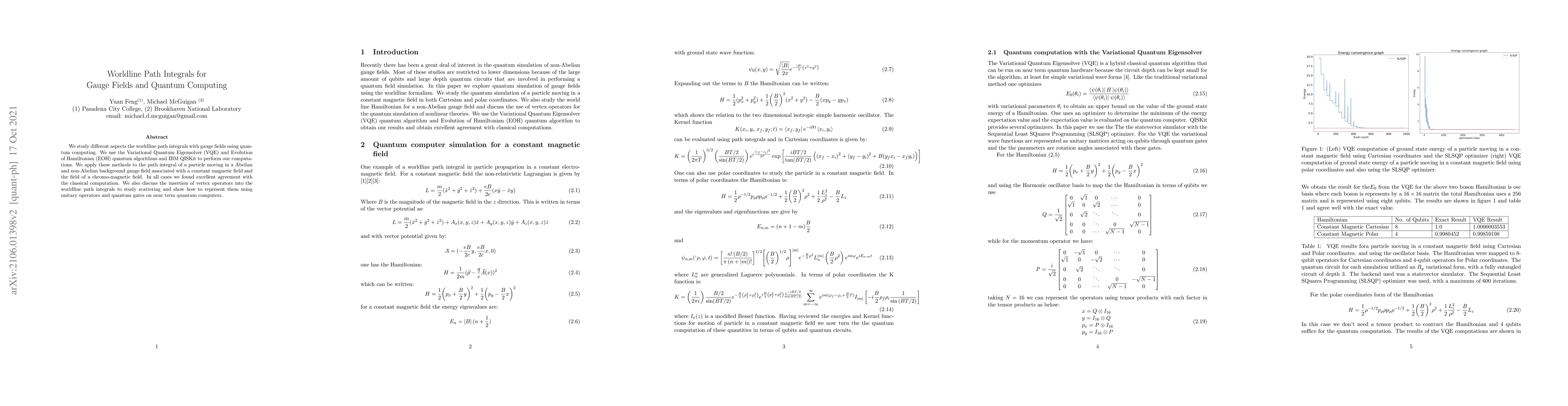 The paper presents a method to simulate quantum systems using worldline path integrals and quantum computing, specifically applying VQE and EOH algorithms to study particles in magnetic fields with gauge fields.