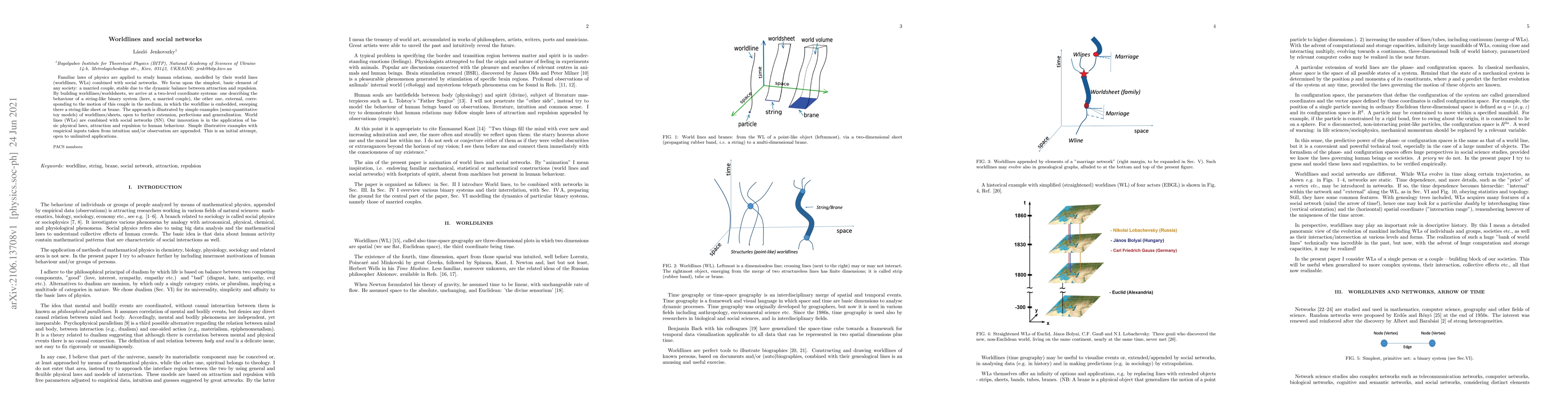 Familiar laws of physics are applied to study human relations, modelled by their world lines (worldlines, WLs) combined with social networks. We focus upon the simplest, basic element of any society: a married couple, stable due to the dynamic balance between attraction and repulsion. By building worldlines/worldsheets, we arrive at a two-level coordinate systems: one describing the behaviour of a string-like binary system (here, a married couple), the other one, external, corresponding to the motion of this couple in the medium, in which the worldline is embedded, sweeping there a string-like sheet or brane. The approach is illustrated by simple examples (semi-quantitative toy models) of worldlines/sheets, open to further extension, perfections and generalization. World lines (WLs) are combined with social networks (SN). Our innovation is in the application of basic physical laws, attraction and repulsion to human behaviour. Simple illustrative examples with empirical inputs taken from intuition and/or observation are appended. This is an initial attempt, open to unlimited applications.