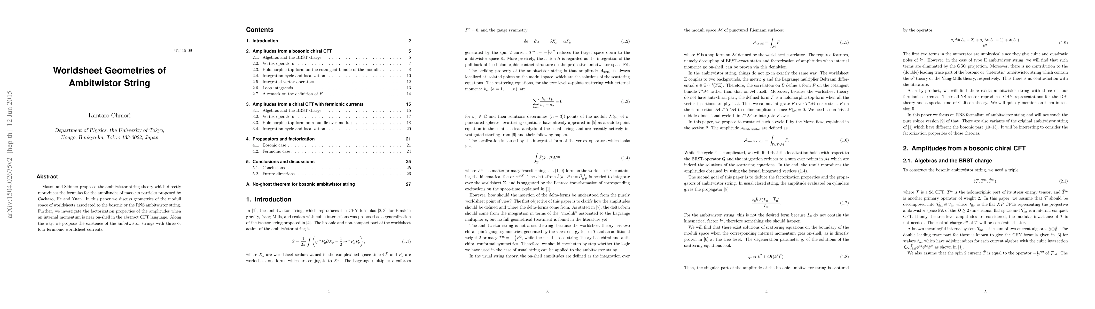 Mason and Skinner proposed the ambitwistor string theory which directly reproduces the formulas for the amplitudes of massless particles proposed by Cachazo, He and Yuan. In this paper we discuss geometries of the moduli space of worldsheets associated to the bosonic or the RNS ambitwistor string. Further, we investigate the factorization properties of the amplitudes when an internal momentum is near on-shell in the abstract CFT language. Along the way, we propose the existence of the ambitwistor strings with three or four fermionic worldsheet currents.