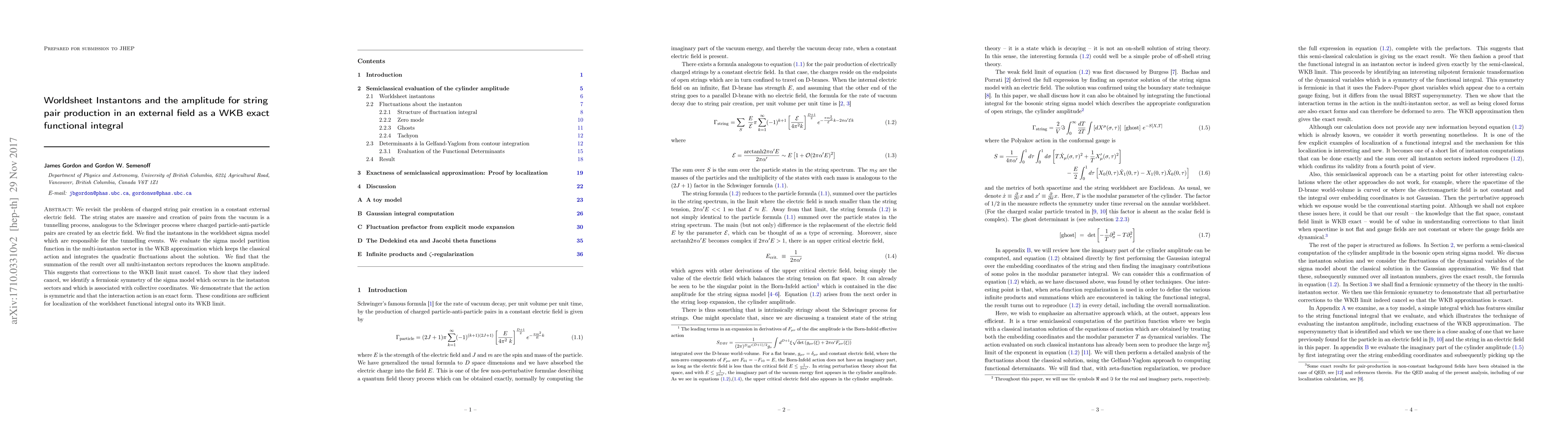 This paper investigates charged string pair creation in a constant external electric field, identifying worldsheet instantons responsible for tunnelling events. The authors evaluate the sigma model partition function using the WKB approximation, showing that the summation over multi-instanton sectors reproduces the known amplitude, suggesting that corrections to the WKB limit cancel due to a fermionic symmetry associated with collective coordinates.