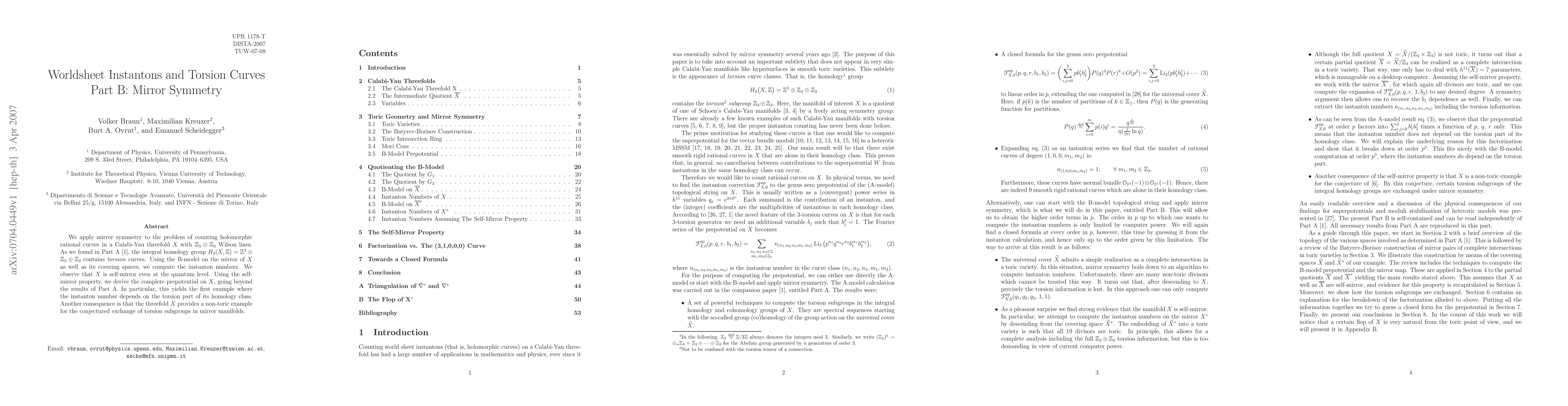 We apply mirror symmetry to the problem of counting holomorphic rational curves in a Calabi-Yau threefold X with Z_3 x Z_3 Wilson lines. As we found in Part A [hep-th/0703182], the integral homology group H_2(X,Z)=Z^3 + Z_3 + Z_3 contains torsion curves. Using the B-model on the mirror of X as well as its covering spaces, we compute the instanton numbers. We observe that X is self-mirror even at the quantum level. Using the self-mirror property, we derive the complete prepotential on X, going beyond the results of Part A. In particular, this yields the first example where the instanton number depends on the torsion part of its homology class. Another consequence is that the threefold X provides a non-toric example for the conjectured exchange of torsion subgroups in mirror manifolds.