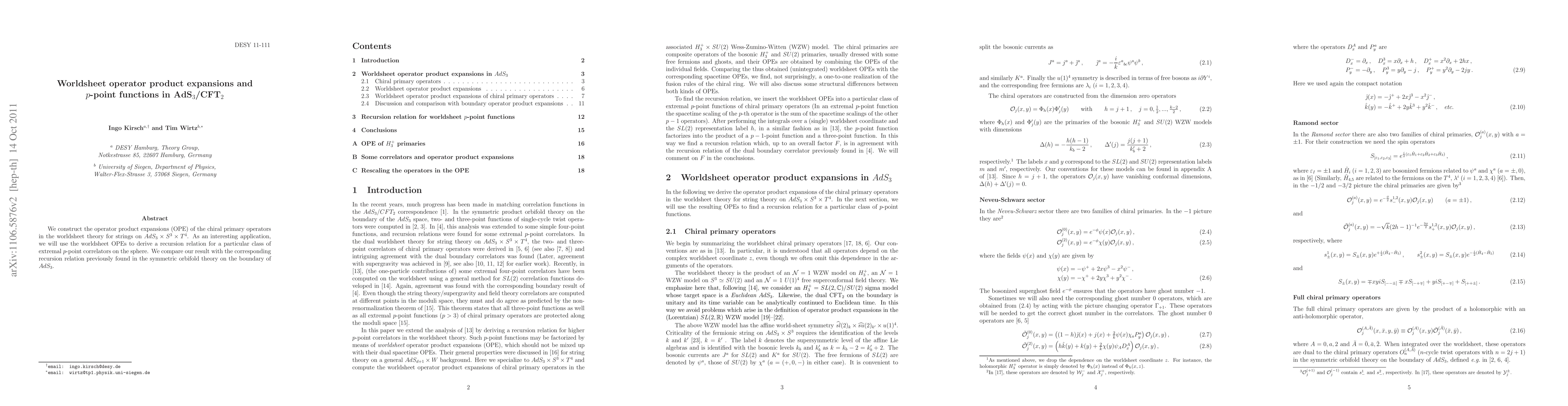 We construct the operator product expansions (OPE) of the chiral primary operators in the worldsheet theory for strings on AdS_3 x S^3 x T^4. As an interesting application, we will use the worldsheet OPEs to derive a recursion relation for a particular class of extremal p-point correlators on the sphere. We compare our result with the corresponding recursion relation previously found in the symmetric orbifold theory on the boundary of AdS_3.