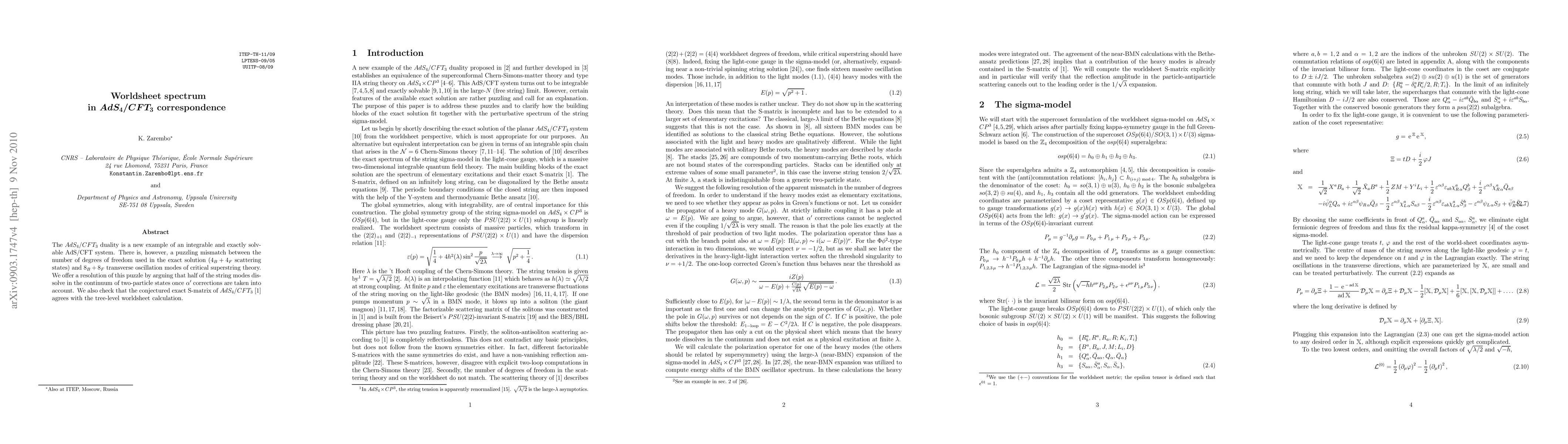 The AdS(4)/CFT(3) correspondence reveals a mismatch between degrees of freedom in exact solutions and string theory modes. The discrepancy is resolved by showing that half of the string modes merge with two-particle states upon considering α' corrections, aligning the exact S-matrix with tree-level worldsheet calculations.