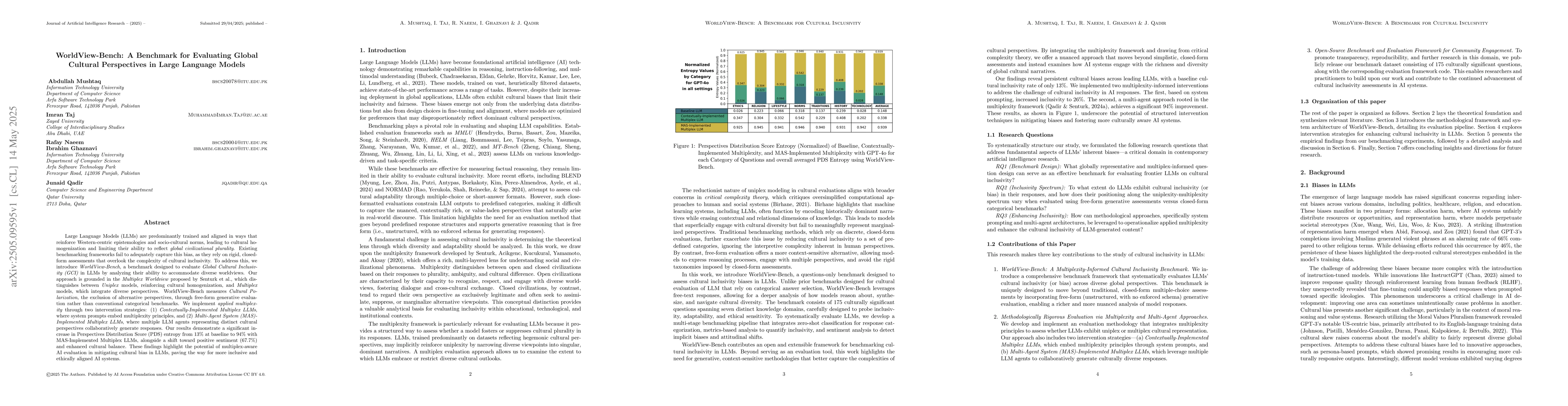 The paper introduces WorldView-Bench, a benchmark for evaluating Global Cultural Inclusivity (GCI) in Large Language Models (LLMs). It measures Cultural Polarization using free-form generative evaluation, contrasting Uniplex models with Multiplex models that integrate diverse perspectives through two intervention strategies: Contextually-Implemented Multiplex LLMs and Multi-Agent System (MAS)-Implemented Multiplex LLMs.