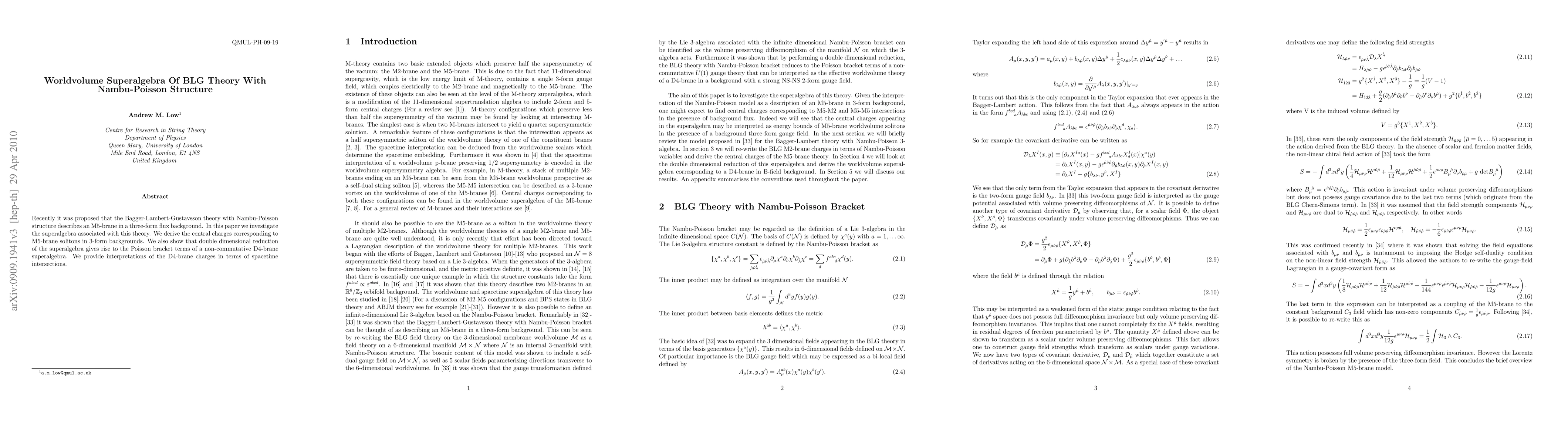 This paper investigates the worldvolume superalgebra of Bagger-Lambert-Gustavsson (BLG) theory with Nambu-Poisson structure, deriving central charges for M5-brane solitons in three-form flux backgrounds and demonstrating that its dimensional reduction leads to the Poisson bracket terms of a non-commutative D4-brane superalgebra.