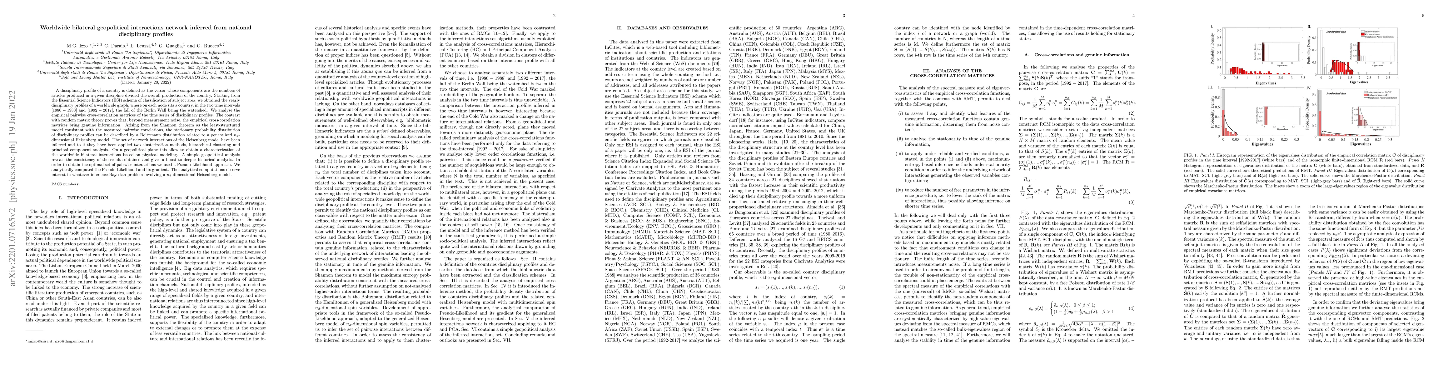 A disciplinary profile of a country is defined as the versor whose components are the numbers of articles produced in a given discipline divided the overall production of the country. Starting from the Essential Science Indicators (ESI) schema of classification of subject area, we obtained the yearly disciplinary profiles of a worldwide graph, where on each node sits a country, in the two time intervals [1980-1988] and [1992-2017], the fall of the Berlin Wall being the watershed. We analyse the empirical pairwise cross-correlation matrices of the time series of disciplinary profiles. The contrast with random matrix theory proves that, beyond measurement noise, the empirical cross-correlation matrices bring genuine information. Arising from the Shannon theorem as the least-structured model consistent with the measured pairwise correlations, the stationary probability distribution of disciplinary profiles can be described by a Boltzmann distribution related to a generalized $n_d$-dimensional Heisenberg model. The set of network interactions of the Heisenberg model have been inferred and to it they have been applied two clusterization methods, hierarchical clustering and principal component analysis. On a geopolitical plane this allow to obtain a characterization of the worldwide bilateral interactions based on physical modeling. A simple geopolitical analysis reveals the consistency of the results obtained and gives a boost to deeper historical analysis. In order to obtain the optimal set of pairwise interactions we used a Pseudo-Likelihood approach. We analytically computed the Pseudo-Likelihood and its gradient. The analytical computations deserve interest in whatever inference Bayesian problem involving a $n_d$-dimensional Heisenberg model.
