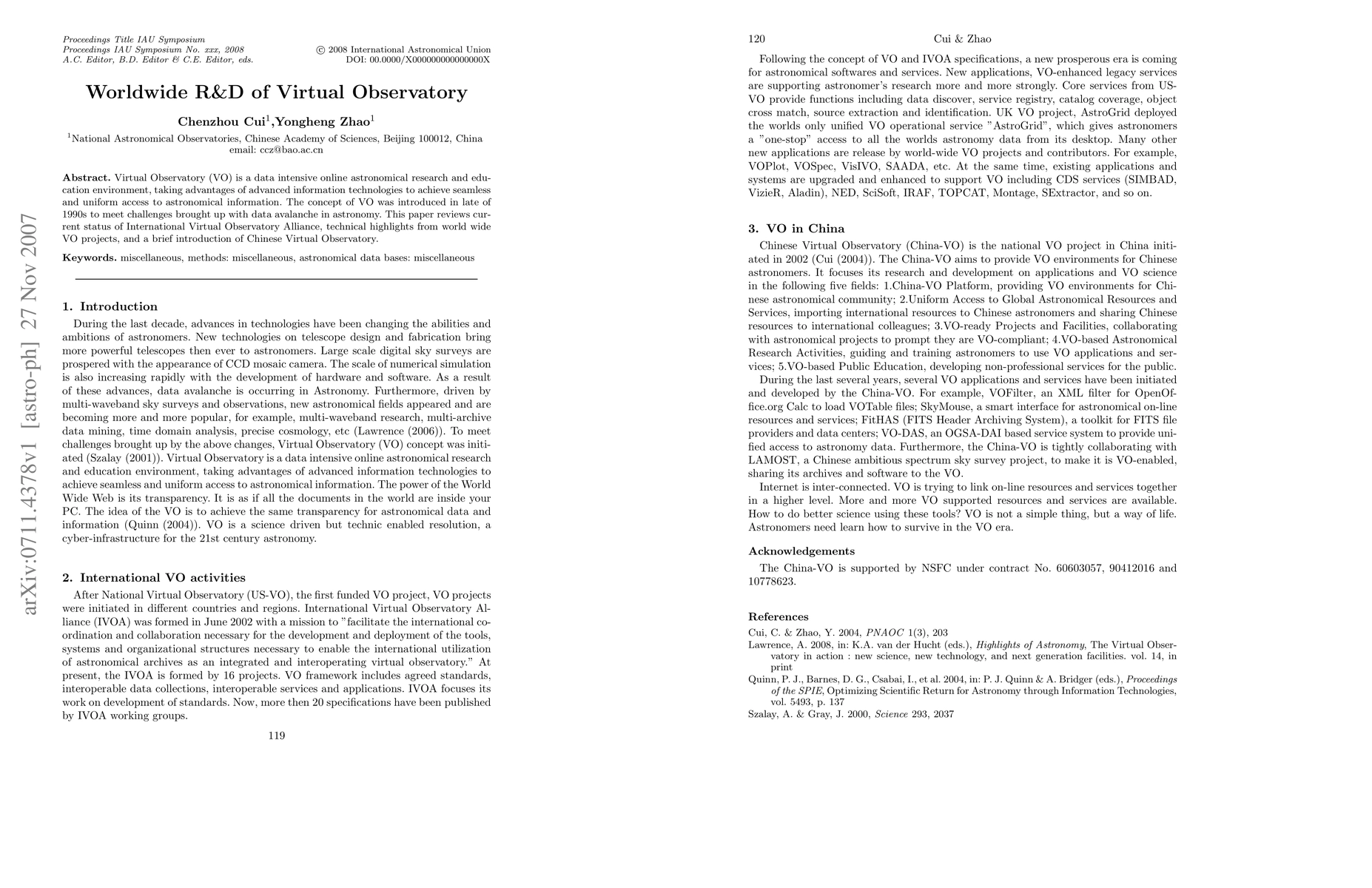 The paper reviews the current status of the International Virtual Observatory Alliance (IVOA), highlights technical advancements from global VO projects, and provides an introduction to the Chinese Virtual Observatory (China-VO).