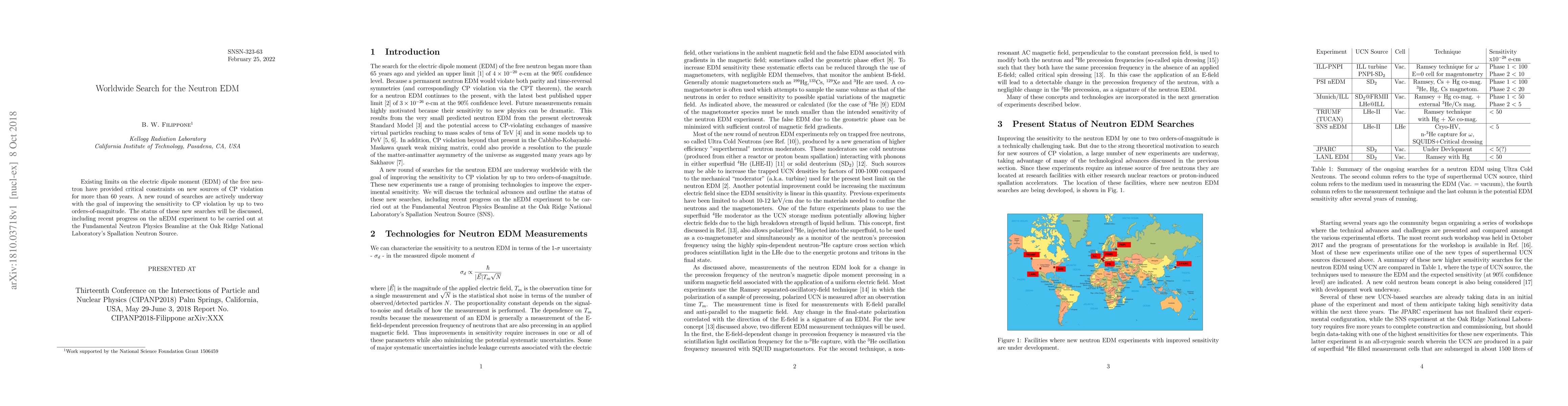 Existing limits on the electric dipole moment (EDM) of the free neutron have provided critical constraints on new sources of CP violation for more than 60 years. A new round of searches are actively underway with the goal of improving the sensitivity to CP violation by up to two orders-of-magnitude. The status of these new searches will be discussed, including recent progress on the nEDM experiment to be carried out at the Fundamental Neutron Physics Beamline at the Oak Ridge National Laboratory's Spallation Neutron Source.