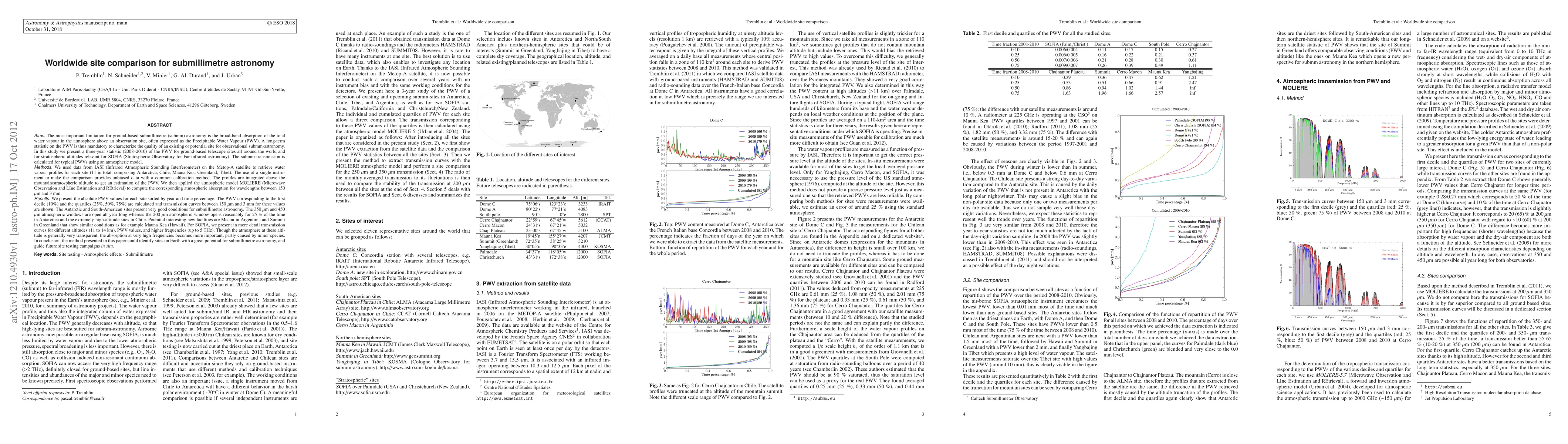 This study provides a three-year statistic (2008-2010) on Precipitable Water Vapour (PWV) for global ground-based telescope sites and stratospheric altitudes relevant for SOFIA, assessing their suitability for submillimetre astronomy. The Antarctic and South-American sites, along with new potential facilities like Macon in Argentina and Summit in Greenland, show very favorable conditions for submillimetre observations.