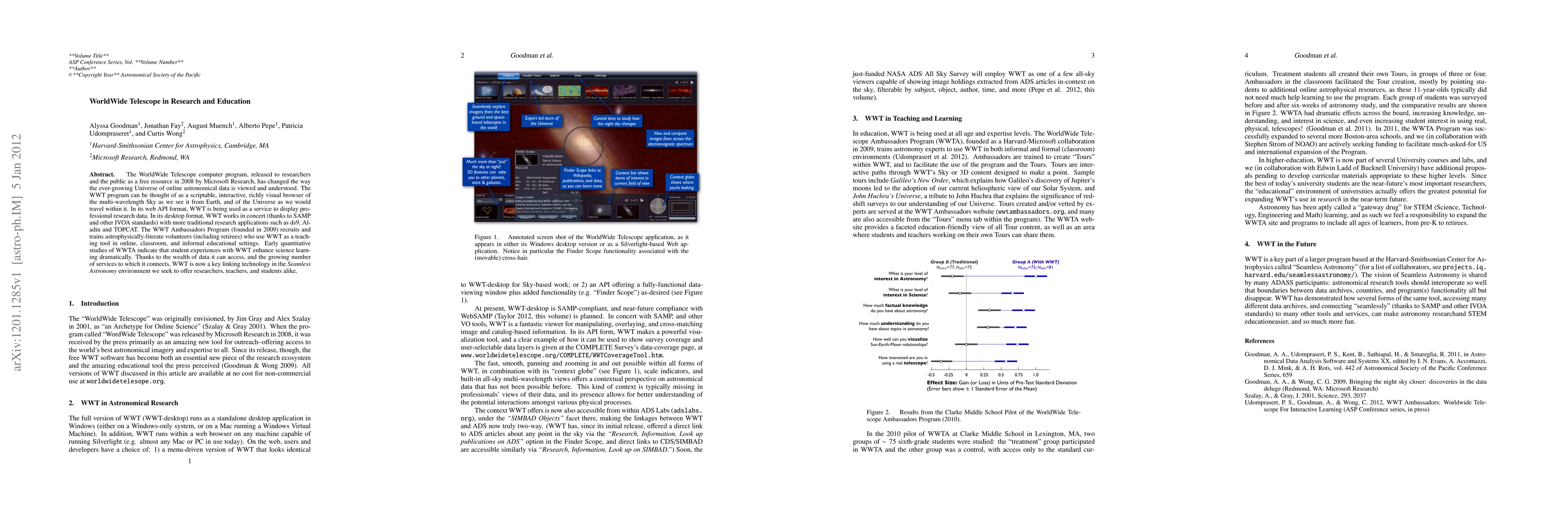 The WorldWide Telescope (WWT) program, free and accessible since 2008, has transformed astronomical data visualization and understanding. It's used in research for displaying professional data and in education, significantly enhancing student learning, thanks to its vast data access and connections to other services.