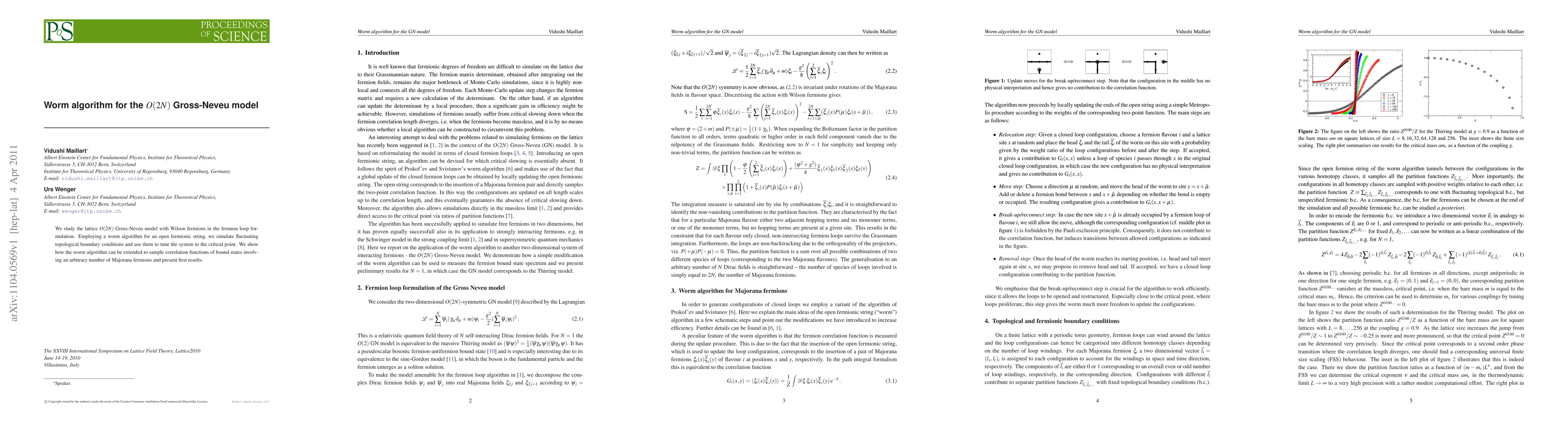 This paper investigates the O(2N) Gross-Neveu model using a worm algorithm to simulate topological boundary conditions and tune the system to the critical point. The authors extend the worm algorithm to sample correlation functions of bound states involving Majorana fermions, presenting initial results.