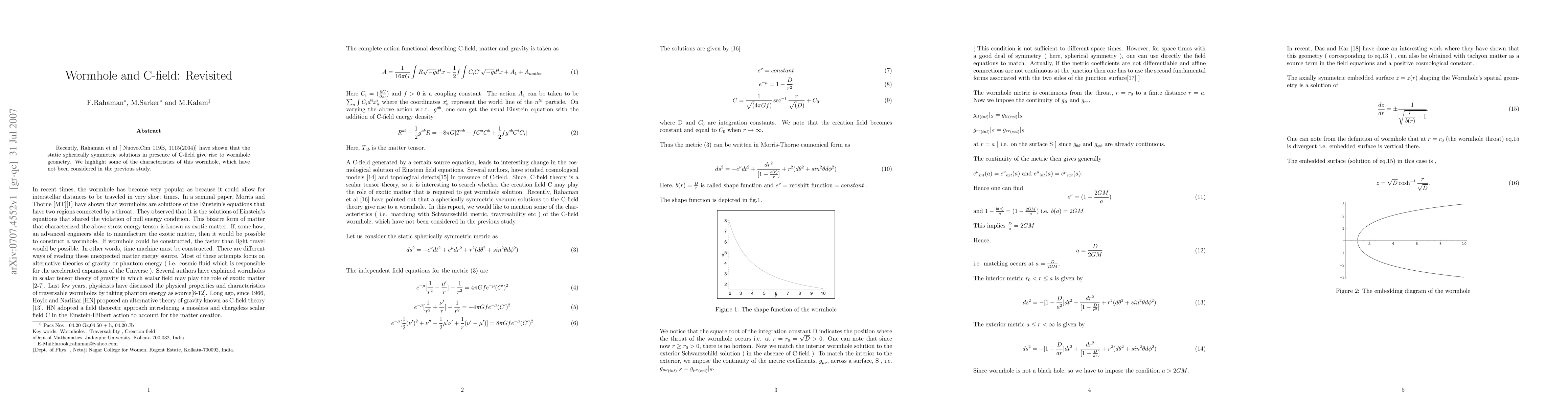 This paper revisits the wormhole geometry arising from static spherically symmetric solutions in the presence of a C-field, emphasizing new characteristics not previously considered in the original study by Rahaman et al. These insights provide a deeper understanding of the wormhole's properties.