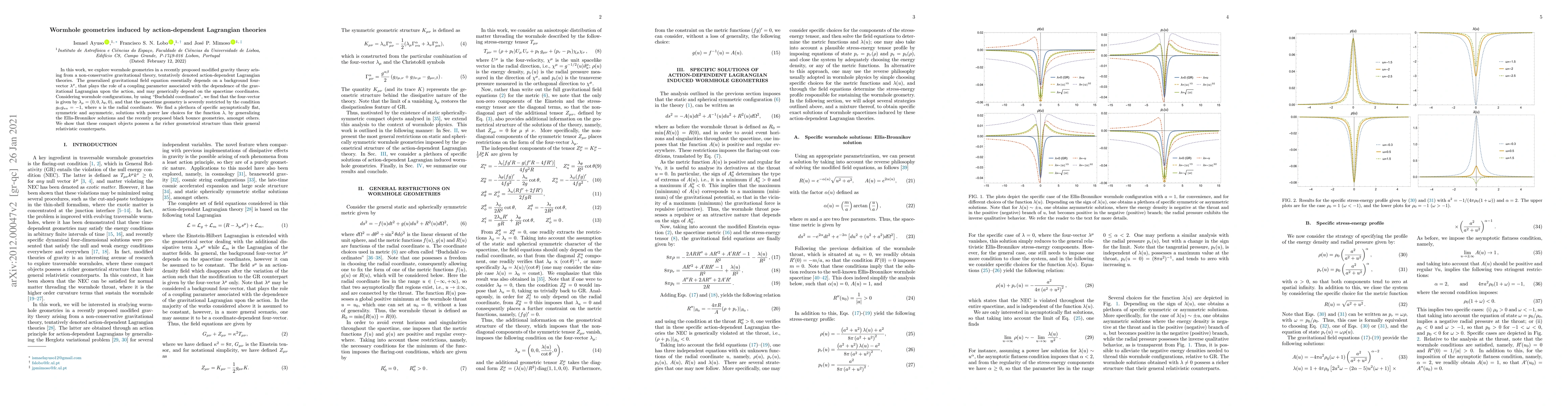 In this work, we explore wormhole geometries in a recently proposed modified gravity theory arising from a non-conservative gravitational theory, tentatively denoted action-dependent Lagrangian theories. The generalized gravitational field equation essentially depends on a background four-vector $\lambda^\mu$, that plays the role of a coupling parameter associated with the dependence of the gravitational Lagrangian upon the action, and may generically depend on the spacetime coordinates. Considering wormhole configurations, by using "Buchdahl coordinates", we find that the four-vector is given by $\lambda_{\mu}=\left(0,0,\lambda_{\theta},0\right)$, and that the spacetime geometry is severely restricted by the condition $g_{tt}g_{uu}=-1$, where $u$ is the radial coordinate. We find a plethora of specific asymptotically flat, symmetric and asymmetric, solutions with power law choices for the function $\lambda$, by generalizing the Ellis-Bronnikov solutions and the recently proposed black bounce geometries, amongst others. We show that these compact objects possess a far richer geometrical structure than their general relativistic counterparts.