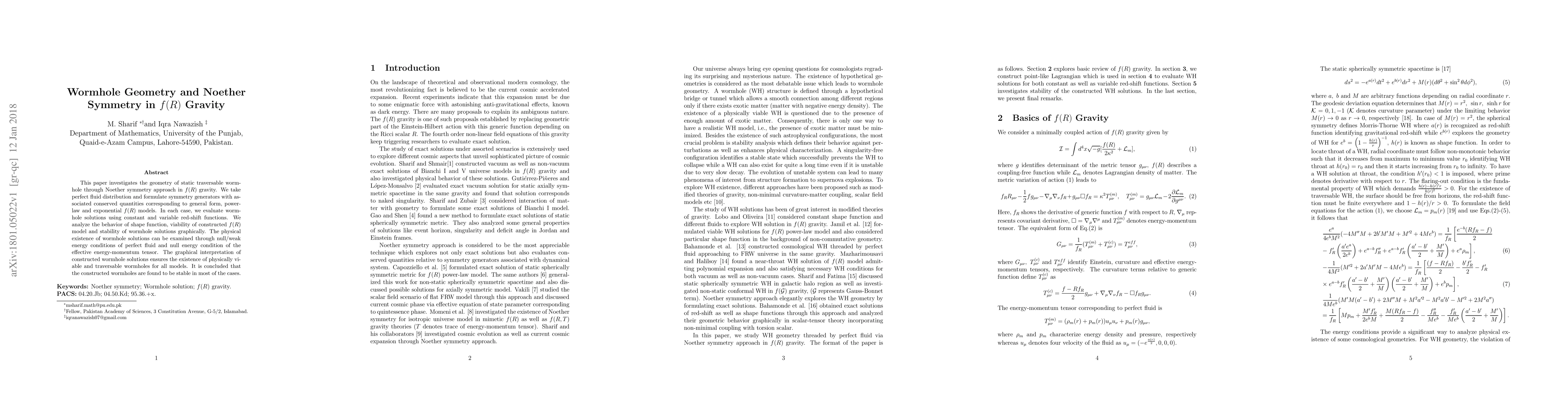 This paper investigates the geometry of static traversable wormhole through Noether symmetry approach in $f(R)$ gravity. We take perfect fluid distribution and formulate symmetry generators with associated conserved quantities corresponding to general form, power-law and exponential $f(R)$ models. In each case, we evaluate wormhole solutions using constant and variable red-shift functions. We analyze the behavior of shape function, viability of constructed $f(R)$ model and stability of wormhole solutions graphically. The physical existence of wormhole solutions can be examined through null/weak energy conditions of perfect fluid and null energy condition of the effective energy-momentum tensor. The graphical interpretation of constructed wormhole solutions ensures the existence of physically viable and traversable wormholes for all models. It is concluded that the constructed wormholes are found to be stable in most of the cases.