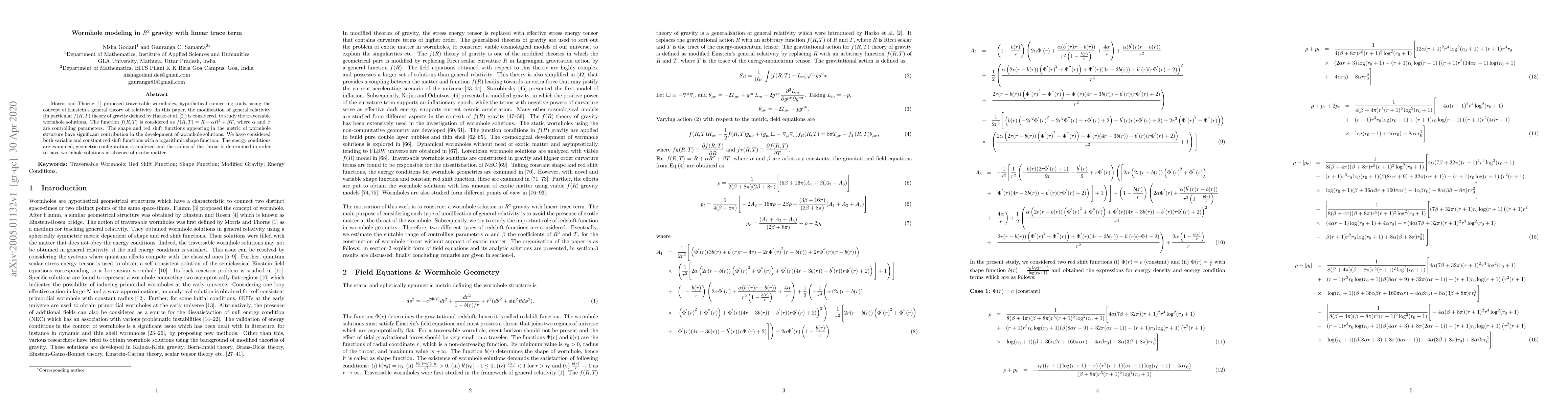 Morris and Thorne \cite{morris1} proposed traversable wormholes, hypothetical connecting tools, using the concept of Einstein's general theory of relativity. In this paper, the modification of general relativity (in particular $f(R,T)$ theory of gravity defined by Harko et al. \cite{harko}) is considered, to study the traversable wormhole solutions. The function $f(R,T)$ is considered as $f(R,T)=R+\alpha R^2+\beta T$, where $\alpha$ and $\beta$ are controlling parameters. The shape and red shift functions appearing in the metric of wormhole structure have significant contribution in the development of wormhole solutions. We have considered both variable and constant red shift functions with a logarithmic shape function. The energy conditions are examined, geometric configuration is analyzed and the radius of the throat is determined in order to have wormhole solutions in absence of exotic matter.